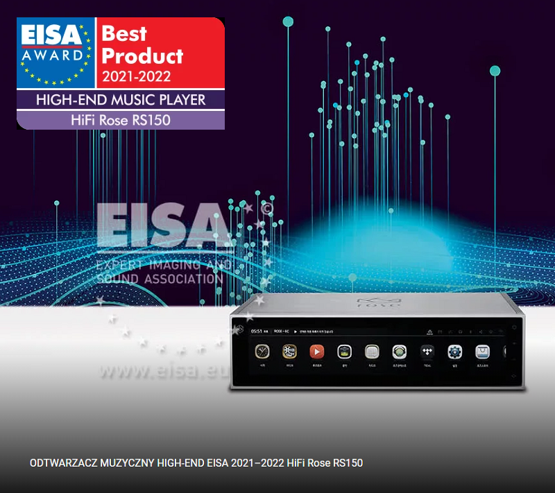 Rose RS150 - streamer sieciowy i odtwarzacz wieloformatowy obsługujący większość plików audio i video wysokiej rozdzielczości. High End. Odtwarzacz Rose RS150 otrzymał nagrodę Best Product 2021-2022 EISA.