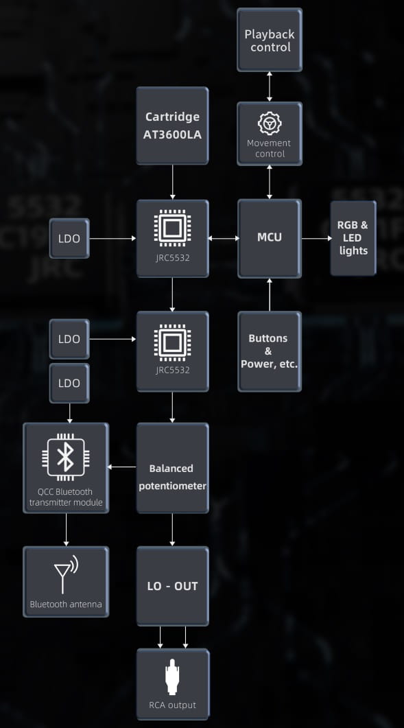 TT13 wykorzystuje platformę Bluetooth firmy Qualcomm i obsługuje transmisję Bluetooth aptX/aptX Low latency/aptX HD/SBC. Dzięki starannie zaprojektowanej architekturze obwodów i unikalnemu przetwarzaniu sygnału jest wyjątkowo niskoszumowa. Tak wysokiej jakości transmisja bezprzewodowa zapewnia czystszy i bardziej muzyczny dźwięk Bluetooth z gramofonu.
