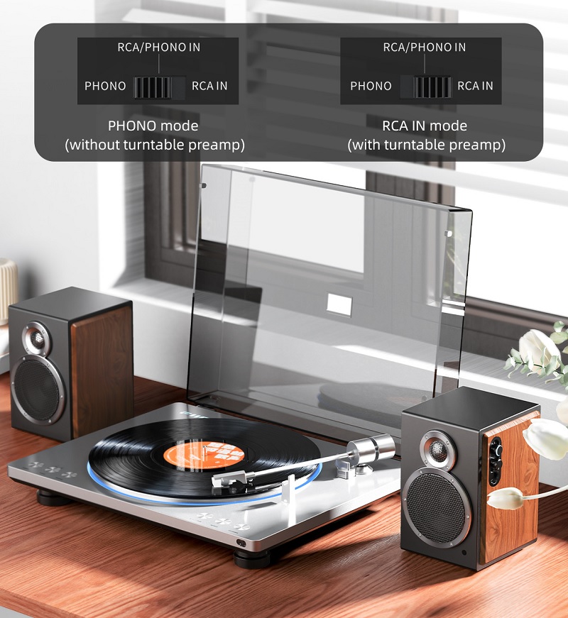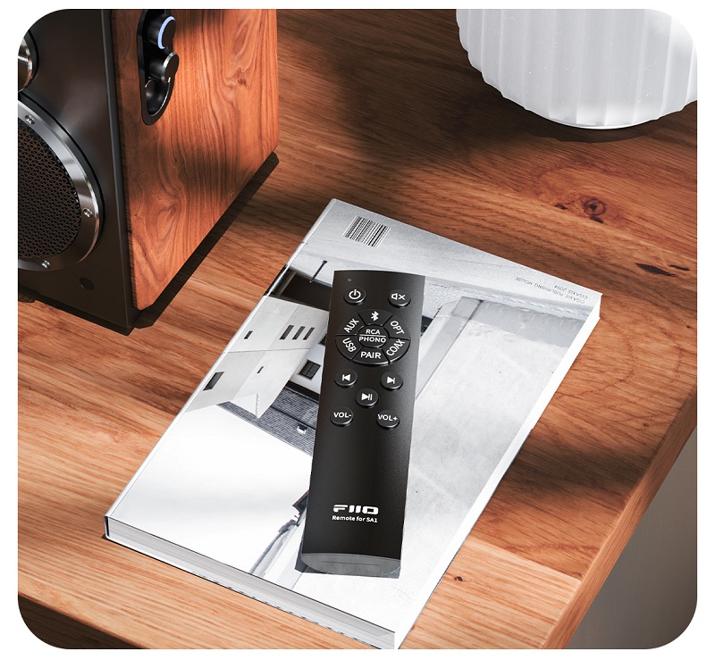 SA1 jest wyposażony we wbudowany przedwzmacniacz gramofonowy, zaprojektowany ze standardową korekcją RIAA, aby zapewnić wierną reprodukcję dźwięku z płyt winylowych. Podczas korzystania z gramofonu winylowego bez wbudowanego przedwzmacniacza (gramofon winylowy ma tylko PHONO OUT), możesz przełączyć SA1 na ustawienie PHONO, aby użyć wewnętrznego przedwzmacniacza gramofonowego SA1. Jeśli gramofon winylowy ma już wbudowany przedwzmacniacz (taki jak FIIO TT13), po prostu należy przełączyć przełącznik wejściowy na RCA IN.
