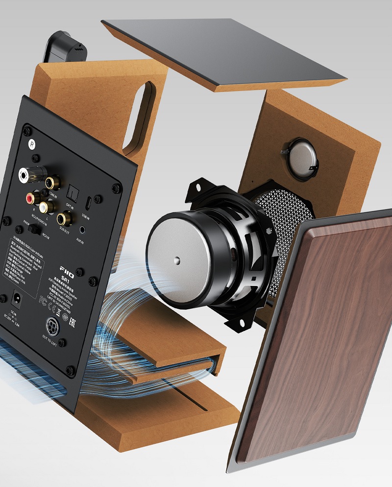 Obudowa SA1 została wykonana z płyty MDF o wysokiej gęstości i grubości do 12 mm. Góra i boki obudowy mają 9 mm grubości o imitacji forniru z litego drewna, co może skutecznie zmniejszyć rezonans dźwięku, zapewniając czystsze i bardziej naturalne brzmienie. Aby uprościć przednią konstrukcję SA1, tak aby wyglądała bardziej zwięźle i uzyskać lepsze rezultaty akustyczne, SA1 wykorzystuje tylny port bass-reflex, który umożliwia rozszerzenie basów do 65 Hz, co daje tym kompaktowym głośnikom dużą moc.