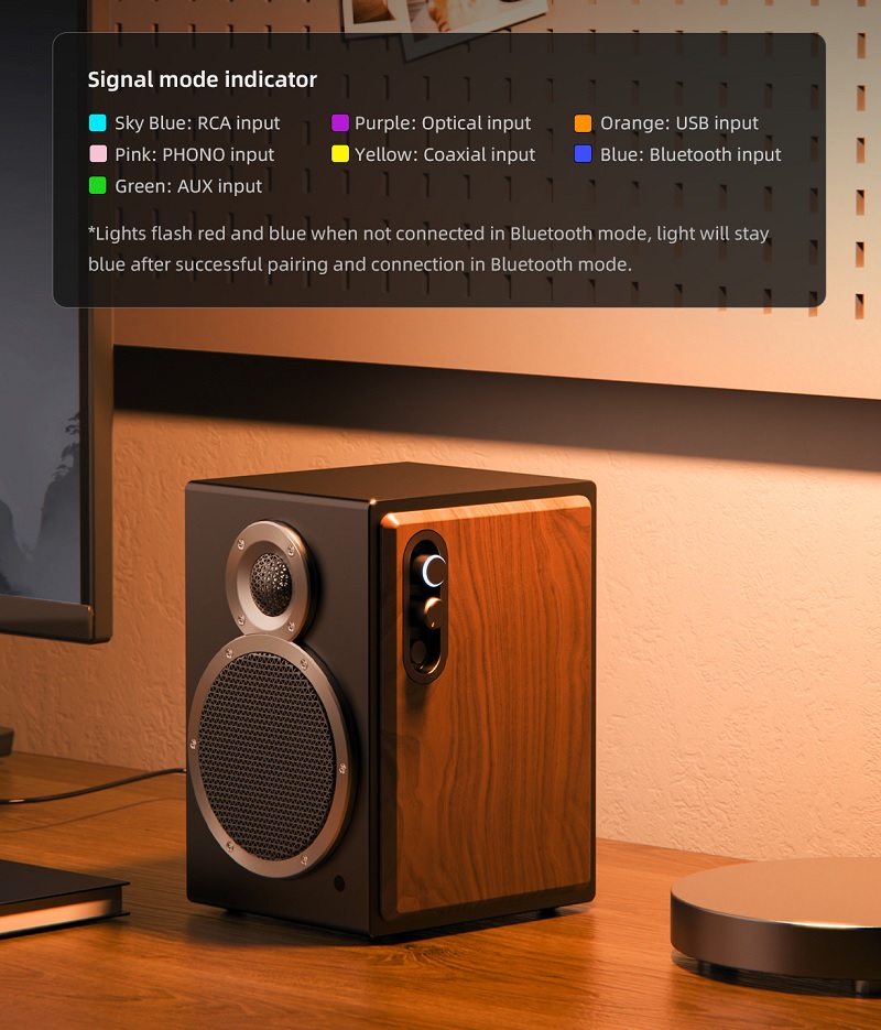 • Wskaźniki sygnału wejściowego: Niebieski: RCA, Różowy: PHONO, Zielony: AUX, Fioletowy: Optyczny, Żółty: Koncentryczny, Pomarańczowy: USB, Niebieski: Bluetooth