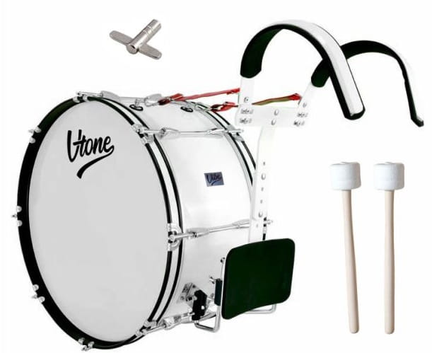 - to biały basowy bęben marszowy o średnicy 22 cali i głębokości 12 cali, zawieszany na ramionach i opierany na brzuchu, posiadający 4-punktową regulację wysokości i płynną regulację kąta nachylenia, w zestawie z pałkami filcowymi i kluczem regulacyjnym