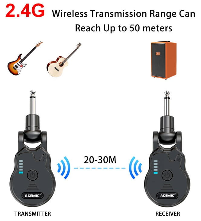 - 2.4G Wireless: System bezprzewodowy G1 do gitary przesyła sygnał w częstotliwości 2.4G, który charakteryzuje się wysoką stabilnością sygnału, niskimi zakłóceniami i bardzo krótkim opóźnieniem dźwięku. Zasięg transmisji bezprzewodowej wynosi do 30 metrów.