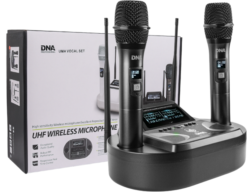 DNA UMA VOCAL SET to idealny zestaw dla zespołów muzycznych, wokalistów śpiewających solo i w duecie, a także osób i firm organizujących panele dyskusyjne, szkolenia i różnego typu spotkania tematyczne. To również świetny bezprzewodowy zestaw mikrofonów do karaoke. Jeśli zastanawiasz się, jaki mikrofon bezprzewodowy wybrać, na pewno warto zwrócić uwagę na DNA UMA VOCAL SET. To znajdujący szerokie zastosowanie system bezprzewodowy renomowanej marki DNA Professional.