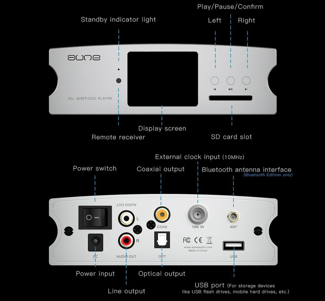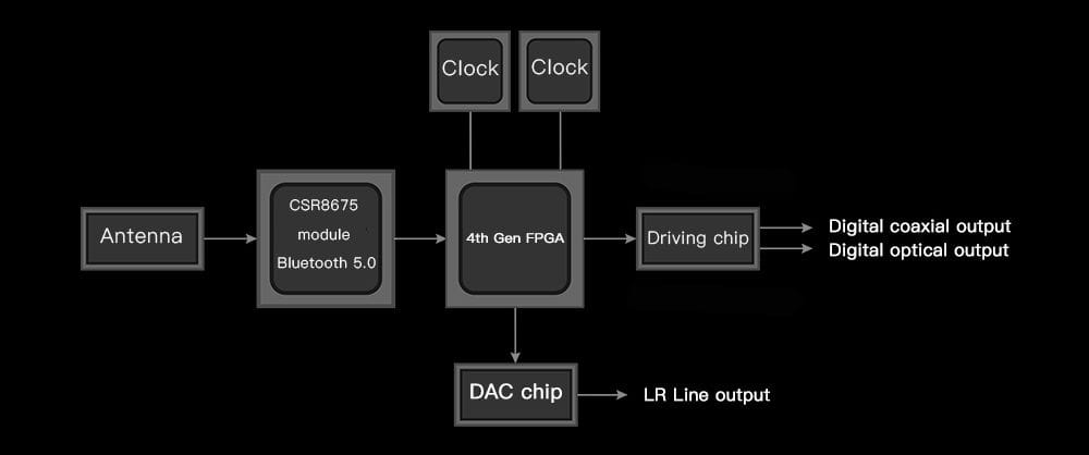 Model aune X5s 8th Anniversary Edition wyposażony jest w moduł CSR8675, który obsługuje łączność Bluetooth 5.0 i popularne kodeki audio, w tym aptX HD. Można więc podłączyć do niego smartfon i bezprzewodowo przesyłać pliki audio w wysokiej rozdzielczości, w tym także z usług streamingu, jak Apple Music, Spotify czy TIDAL. aune X5s może działać również jako nadajnik Bluetooth, przesyłając dane z nośników (microSD, zewnętrzne dyski) do bezprzewodowych słuchawek czy głośników. Gwarantuje to transmisję danych pozbawioną interferencji, jakie mogą wystąpić w smartfonach. aune X5s 8th Anniversary Edition bazuje na 4-generacji autorskiej technologii FPGA w asynchronicznym układzie FIFO oraz zegarze o ultra niskim jitterze. Dzięki temu pliki dekodowane bezpośrednio przez układ ARM trafiają do modułu FPGA, który gwarantuje cyfrowy sygnał o niskim jitterze. Asynchroniczna technologia FPGA wykorzystywana jest również przy obsłudze danych przesyłanych za pomocą standardu Bluetooth. Umożliwia to jednoczesne wypuszczanie dźwięku tak wyjściami cyfrowymi (optyczne i koaksjalne), jak i liniowym (RCA).