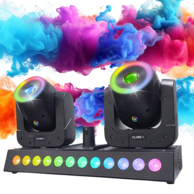 Light4me Clone 1 to profesjonalny efekt świetlny LED, którego źródłami światła są 2 głowice ruchome – wyposażone każda w białą diodę LED o mocy 100 watów i dwanaście diod RGB LED SMD 5050 (efekt ring) – oraz efekt wash – dwanaście diod RGBW LED o mocy 4 watów! Pracą efektu wash i każdej z głowic, w tym efektami diod głównych i efektem ring, można oddzielnie sterować za pomocą protokołu DMX (Pixel Control). Oświetlenie LED świetnie spisuje się na scenach muzycznych, podczas przedstawień i pokazów, w klubach tanecznych i dyskotekach, a także jako dynamiczne oświetlenie dla zespołów weselnych i mobilnych DJ-ów ✅.