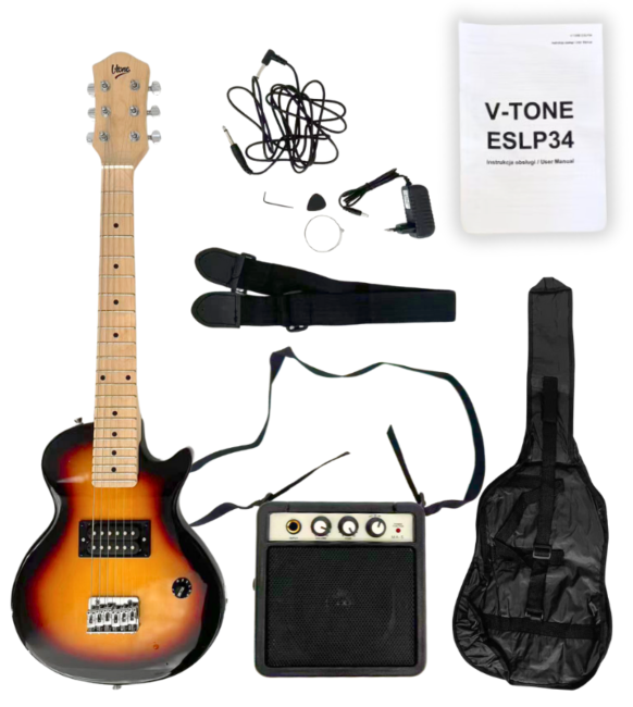 V-TONE ESLP34 SB to kompletny zestaw gitarowy dla początkujących i średnio zaawansowanych gitarzystów, którzy cenią sobie niesamowite, dźwięczne brzmienie gitar elektrycznych i chcą rozpocząć swoją przygodę z tym instrumentem ✅. Dzięki V-TONE ESLP34 SB nie musisz osobno kupować gitary, przetworników, wzmacniacza, okablowania, paska, kostki do gry, zapasowej struny, klucza imbusowego albo pokrowca – teraz wszystko otrzymujesz w jednej kompletnej paczce ✅!