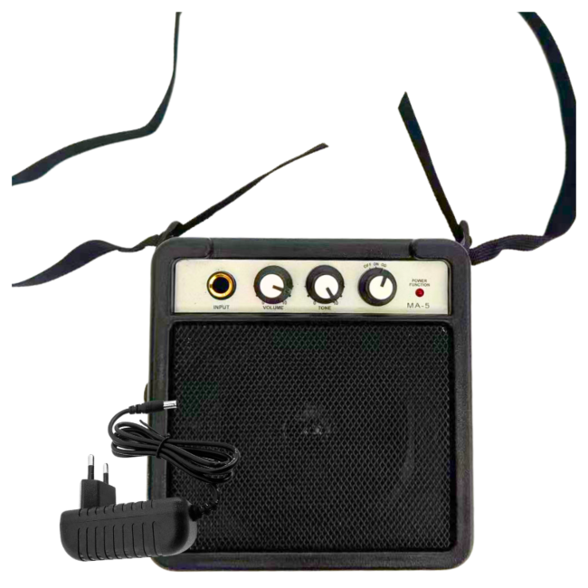 „Piecyk” gitarowy zestawu V-TONE ESLP34 SB ma moc 5 watów oraz wyjście słuchawkowe jack 6,3 mm, dlatego jest idealny do grania w domu, ale nie tylko. Combo może być zasilane bateryjnie lub sieciowo za pomocą dołączonego do zestawu zasilacza - sprawia to, że zestaw jest przenośny i pozwala na grę w dowolnym miejscu ✅. 3-calowy głośnik zamknięty został w klasycznej, czarnej obudowie. Nad nim znajduje się panel wzmacniacza gitarowego z wejściem instrumentalnym mono typu jack 6,3 mm umożliwiającym podłączenie gitary do combo ✅. Panel wzmacniacza zawiera dwa potencjometry regulujące głośność oraz korekcję barwową dźwięku ✅. Dodatkowo skorzystanie z efektu Overdrive (OD) powoduje przesterowanie sygnału gitarowego, co umożliwia uzyskanie specyficznego, „brudniejszego” brzmienia charakterystycznego dla takich gatunków muzycznych jak blues, rock czy metal ✅.