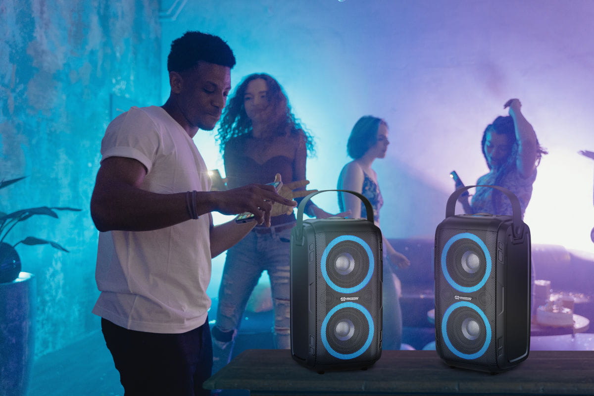 Głośnik Party-one to głośnik o zaskakująco dużych możliwościach jak na jego kompaktowe rozmiary. Maksymalna moc szczytowa 80W (50W RMS) w połączeniu z wysoką efektywnością przetworników umożliwia nagłośnienie nawet dużego pomieszczenia. Dźwięk stereo bogaty jest w dużą ilość basu (już od 80hz) i wyraźnych wysokich tonów. Wydajne, szerokopasmowe przetworniki mają średnicę aż 102 mm a wysokotonowe tweetery 32 mm. Wspólnie tworzą nieskazitelną jakość, niezależnie od tego jakiego gatunku muzyki słuchasz i w jakim miejscu jesteś. Głośnik wyposażony jest w equalizer z dwoma trybami do wyboru (wewnątrz i na zewnątrz pomieszczenia). Swoje urządzenie możesz podłączyć na kilka różnych sposobów. Najwygodniejszym jednak jest najnowszy interfejs Bluetooth 5.0 z bezprzewodowym przesyłaniem muzyki aż do 10 metrów. Możliwe jest też podłączenie głośnika tradycyjnie przewodem AUX lub nawet umieszczenie pendrive z muzyką bezpośrednio w porcie USB i odtwarzanie audio bez smartfona.
