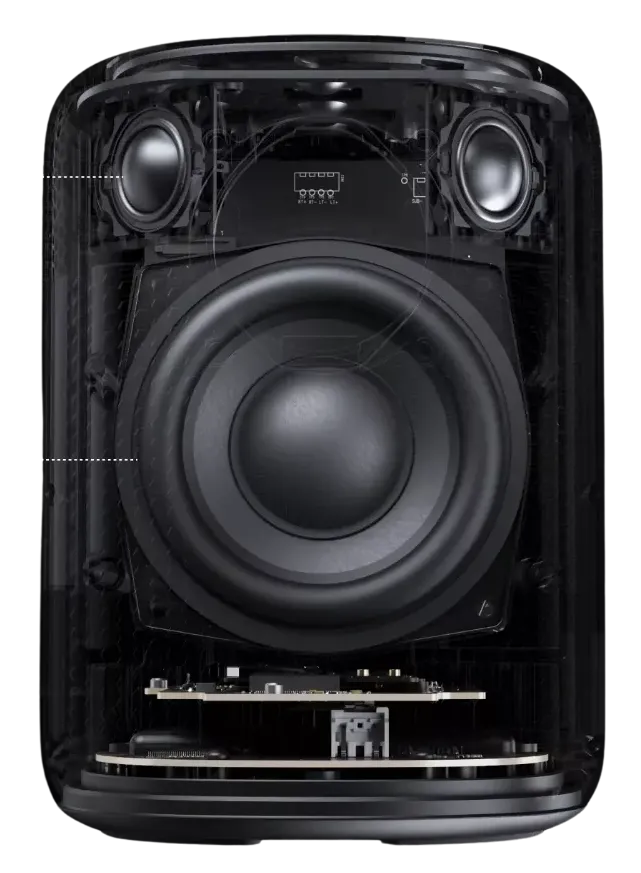 - Moc 100 W i Hi-Res: czterocalowy woofer plus dwa radiatory w trybie dual-balanced dostarczają 100 W mocy, gwarantując dynamiczny, pełny bas i szczegółową górą pasma