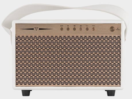 Naturalny i dobrze zrównoważony obraz dźwiękowy Naturalny i dobrze zrównoważony obraz dźwiękowy pochodzi ze sztywnego, średniotonowego głośnika niskotonowego z papierową membraną, który dzięki specjalnej powłoce może pracować zarówno przy niskich, jak i wysokich poziomach głośności, oraz jedwabnej kopułki głośnika wysokotonowego z wysokiej jakości magnesem neodymowym, który zapewnia ostry i bardzo szczegółowy dźwięk. Aby bas był mocny i precyzyjny, obudowa wykonana jest z MDF i wyposażona w port reflex, wraz z nóżkami akustycznymi, cechy te minimalizują straty efektu na wibracje i pozwalają głośnikowi niskotonowemu w pełni wykorzystać jego możliwości. Panel kontrolny i niestandardowa maskownica Dynavoice są w kolorze miedzianym, wykonane z anodyzowanego aluminium, dzięki czemu są wyjątkowo odporne, a dołączony pasek ułatwia przenoszenie głośnika.