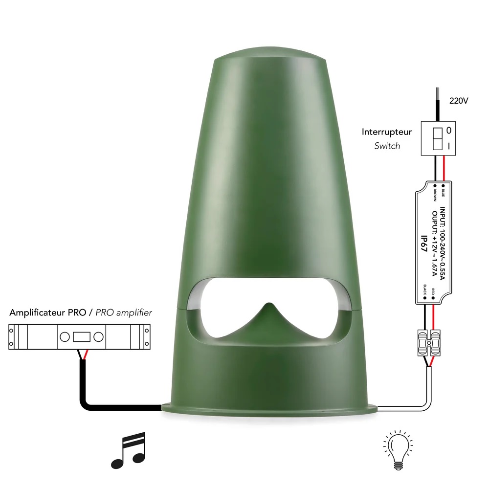 Dostępny w dwóch wersjach kolorystycznych – zielonej i szarej – z łatwością wtapia się w otoczenie ogrodu, tarasu czy ścieżki. Po zmroku głośnik dodatkowo tworzy przytulny klimat dzięki wbudowanemu oświetleniu LED.