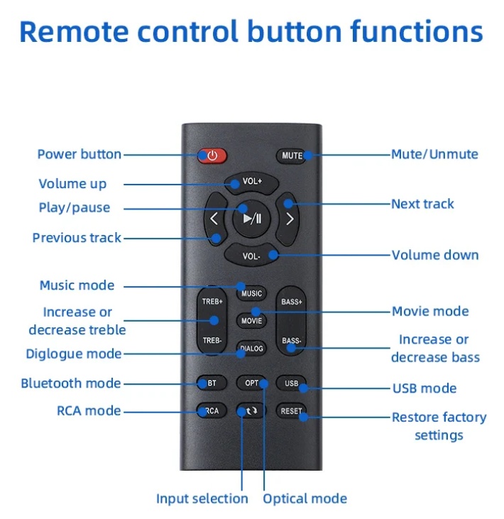 | Inne | Tryb wejściowy: Bluetooth + Optic + RCA + USB |
