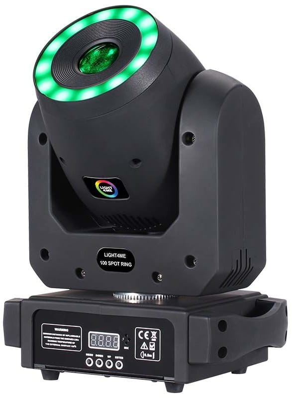 Reflektor estradowy Light4Me 100 Spot Ring umożliwia tworzenie zaawansowanych i w pełni profesjonalnych efektów świetlnych. Głowica LED posiada tarczę z 7 kolorami: czerwonym, żółtym, jasnoniebieskim, zielonym, różowym, pomarańczowym oraz fioletowym. Razem z tarczą gobo z 7 wzorami, pozwala to elastycznie kształtować strumień świetlny. Precyzyjne wyostrzenie krawędzi plamy świetlnej jest możliwe dzięki elektronicznemu focusowi. Istnieje również możliwość wykorzystania rotacyjnego, 5-fasetowego pryzmatu do rozszczepiania światła, a także trybu stroboskopu, co w rezultacie pozwala tworzyć dynamiczne efekty na koncertach i w klubach. Dodatkowe efekty tęczy, efekty gobo shake i gobo flow, a także 10 efektów ring sprawiają, że paleta możliwości kreowania oświetlenia za pomocą tej ruchomej głowicy LED zadowoli każdego realizatora.