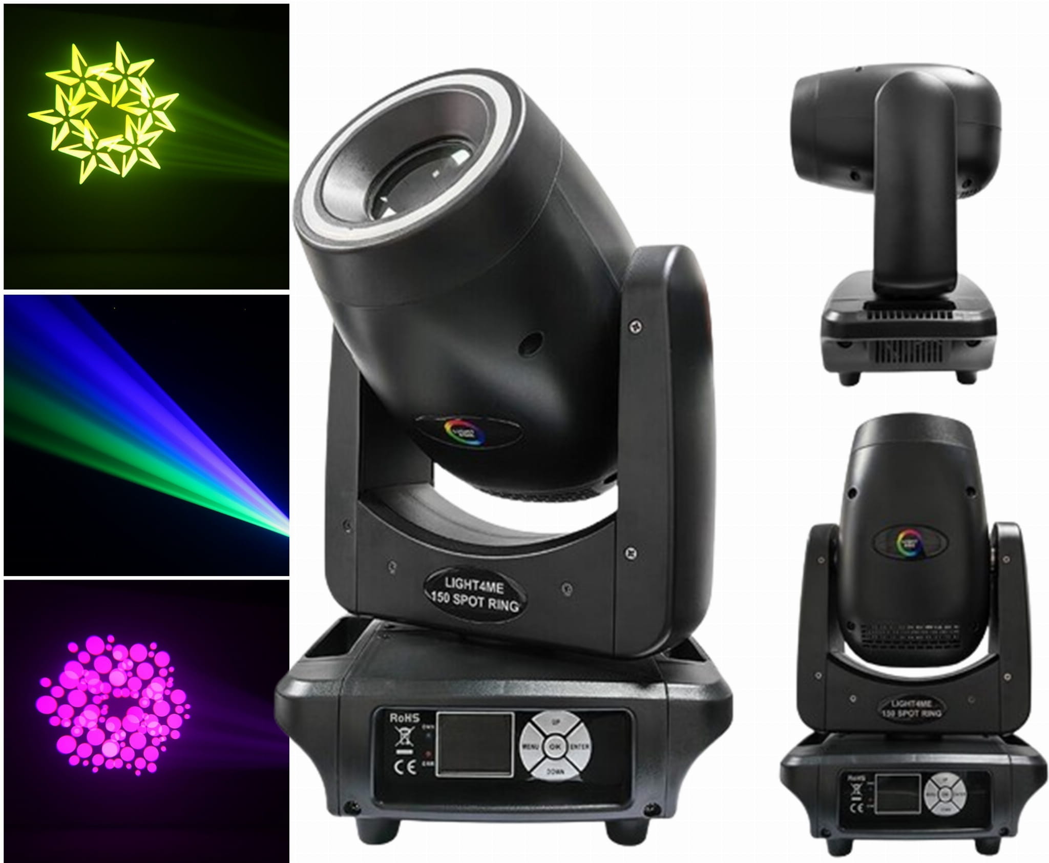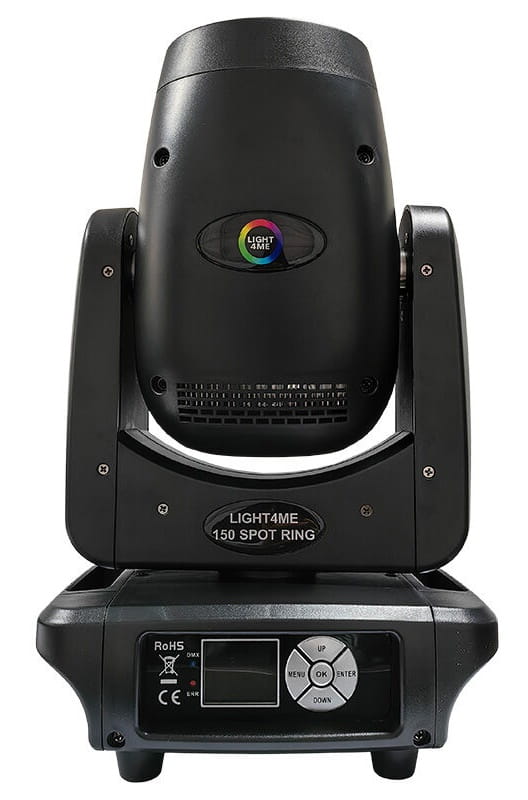 Light4Me 150 Spot Ring posiada solidną obudowę z dwoma uchwytami po bokach, ułatwiającymi przenoszenie głowicy. Na spodzie urządzenia znajdują się otwory montażowe, które dzięki dołączonemu uchwytowi montażowemu, umożliwiają instalację sprzętu na kratownicach i rampach oświetleniowych. Z tyłu znajdują się złącze zasilania i gniazda DMX. Przednia część obejmuje czytelny panel sterowania z cyfrowym wyświetlaczem i pięcioma przyciskami. Za ich pomocą możemy ręcznie zmieniać ustawienia parametrów w menu lub wybrać jeden z ✅ czterech trybów pracy jednostki:
