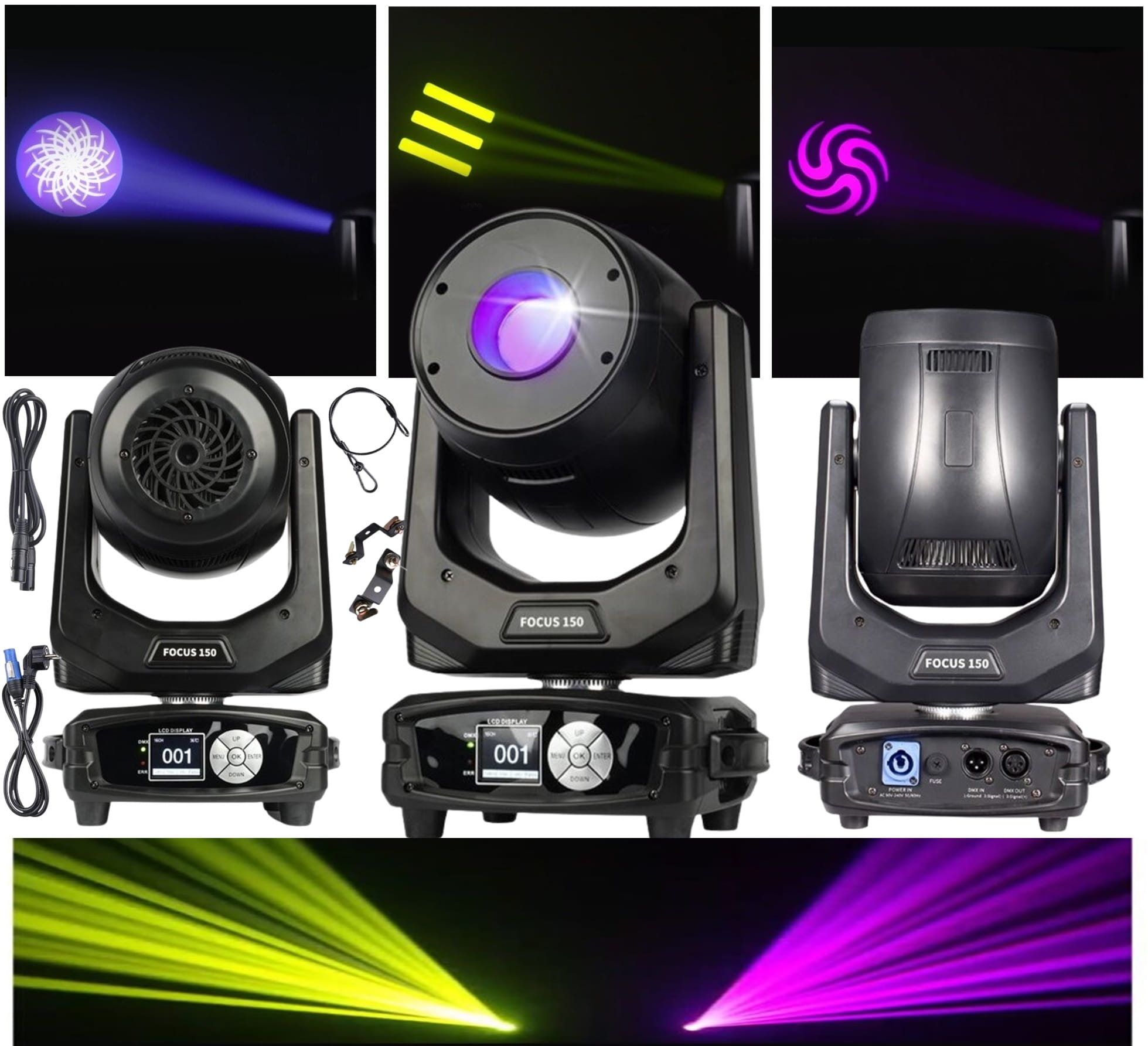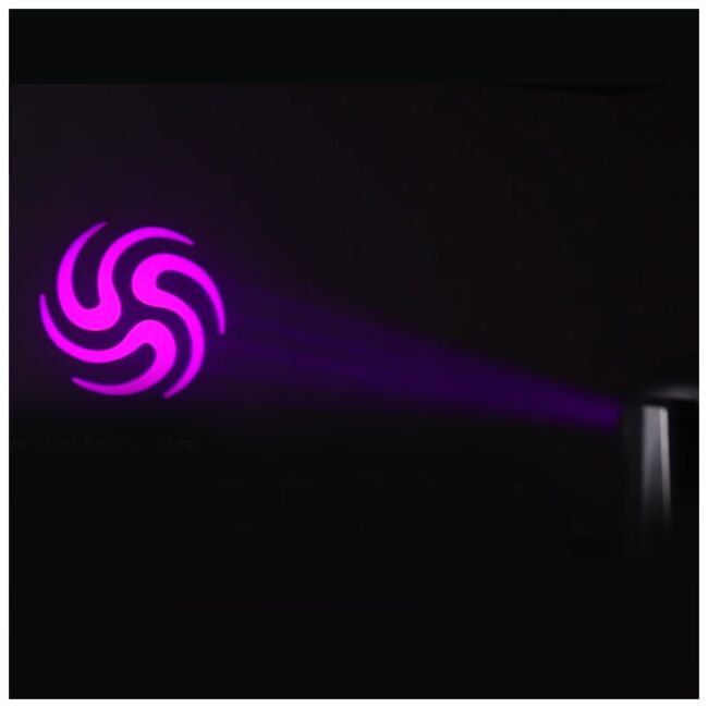 - głowa wyposażona jest w tarczę 9 kolorów, dwie tarcze gobo z 8 (statyczne) oraz 6 (rotacyjne) nowoczesnymi wzorami kształtującymi promień świetlny, a także obrotową pryzmę rozszczepiającą wiązkę