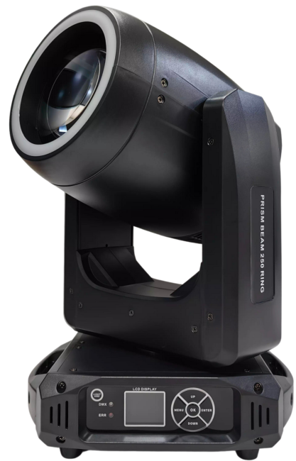 Light4Me Prism Beam 250 Ring to zaawansowana głowica ruchoma typu beam, wyposażona w bardzo mocną, 250-watową lampę wyładowczą oraz dodatkowy pierścień (efekt ring) z 24 diodami LED RGB 3w1 o mocy 0,2 wata każda Głowica ruchoma ma bardzo wąski kąt świecenia wynoszący tylko 2°, który zapewnia wyraźność i skupienie wiązki światła ✨ Urządzenie świetnie sprawdza się na scenach, w domach i ośrodkach kultury, na koncertach, występach, pokazach, galach i prezentacjach, w klubach tanecznych i dyskotekach, a także jako oprawa oświetleniowa dla mobilnych DJ-ów i zespołów eventowych ✅. Dzięki swojej kompaktowej konstrukcji i lekkości, głowa jest niezwykle mobilna, przez co doskonale nadaje się zarówno do pracy w instalacjach stałych i przenośnych⚡.