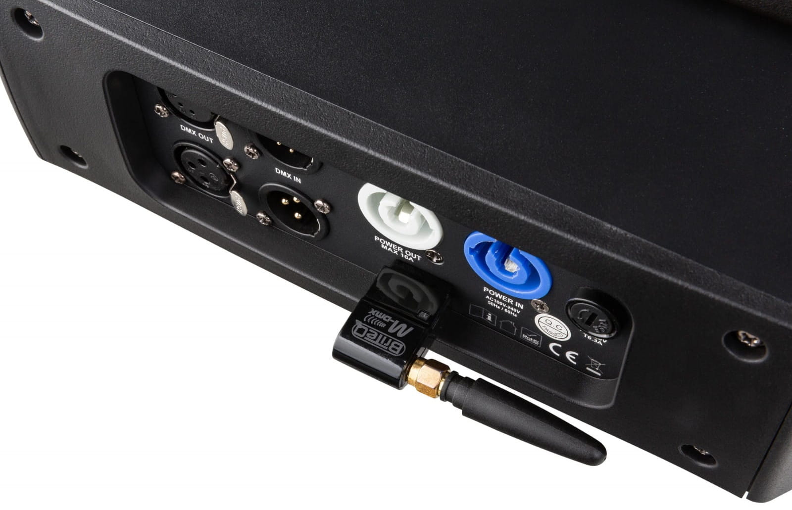 W tylnej części podstawy znajdują się gniazda zasilania PowerCon IN-Out , wejście i wyjście DMX oraz wejście USB dedykowane do montażu bezprzewodowego odbiornika dmx. (Dongl DMX WTR-DMX dostępny osobno w innej ofercie).