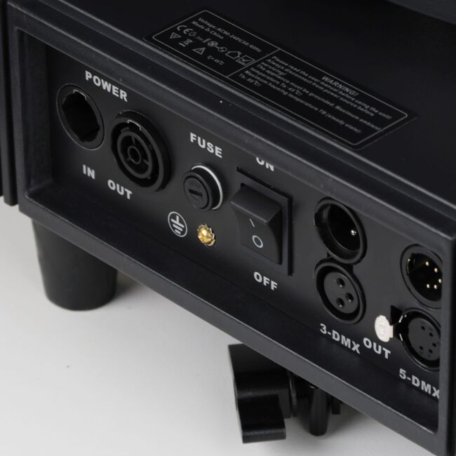 - Efekt stroboskopu: 0-25 Hz, regulowana częstotliwość pracy, 4 efekty (zsynchronizowany, otwieranie pulsacyjne w sekwencjach, zamykanie pulsacyjne w sekwencjach, losowy)