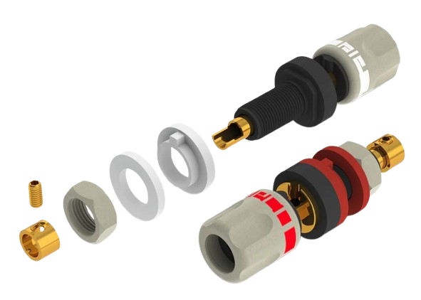 Gniazda głośnikowe ABI-0611G firmy aeco bazują na wysokiej klasy przewodniku z miedzi tellurowej, który pokryty jest złotem. Przygotowywany jest on w procesie precyzyjnego wycinania maszynowego (CNC) jako jeden element, co umożliwia uniknięcie strat przy przesyle sygnału przez materiały o różnej strukturze. Ma on do tego wydrążoną konstrukcję i specjalne nacięcie w kształcie litery “L”, co - w parze z mosiężnym pierścieniem i śrubą - umożliwia łatwy montaż przewodu od głośnika poprzez skręcanie.