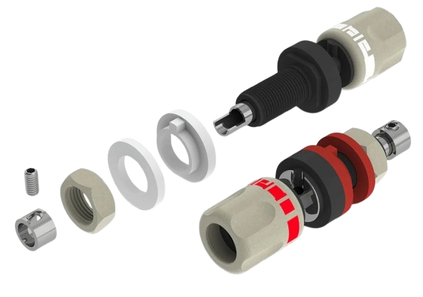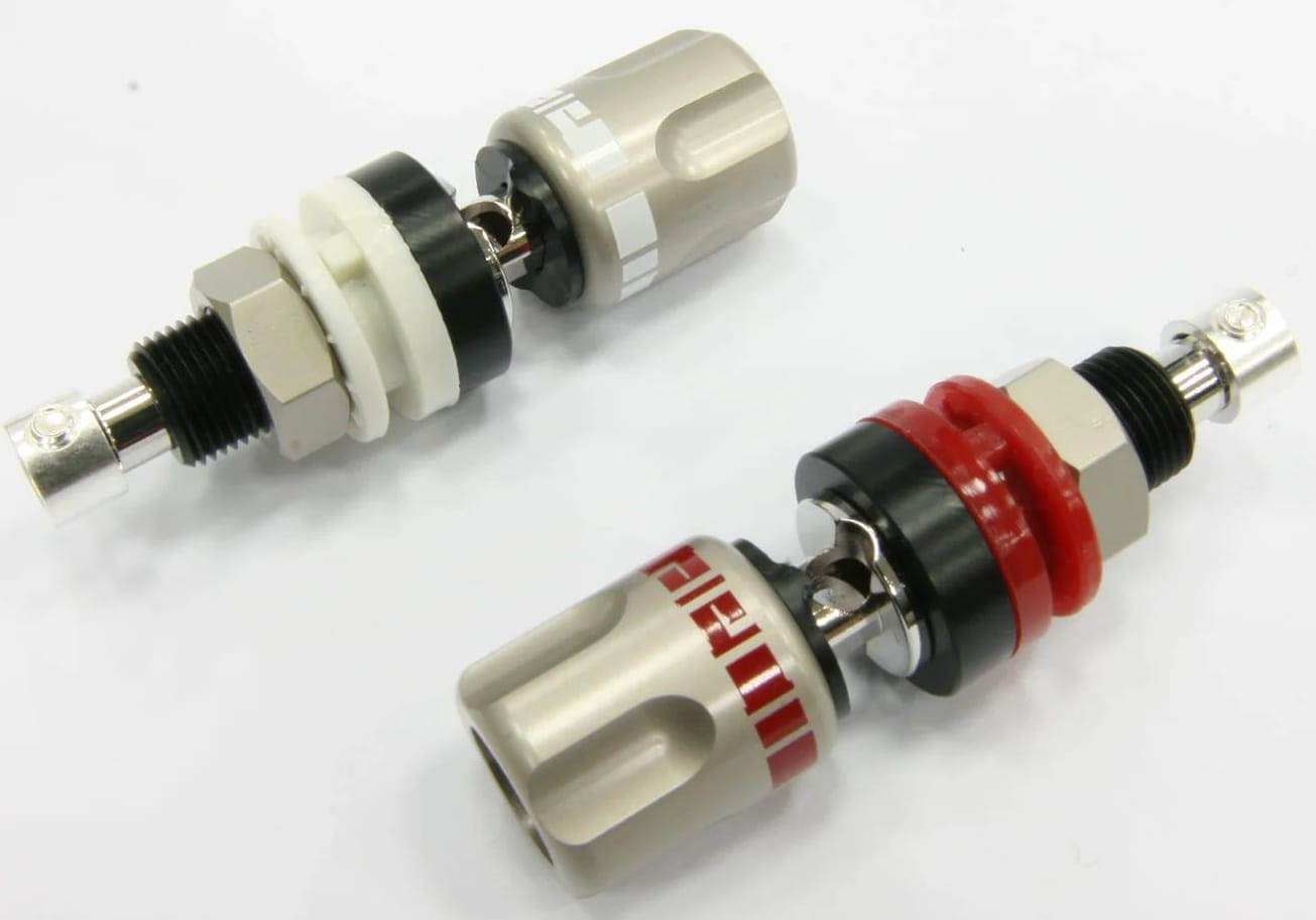 Gniazda głośnikowe ABI-0611R firmy aeco bazują na wysokiej klasy przewodniku z miedzi tellurowej, który pokryty jest rodem. Przygotowywany jest on w procesie precyzyjnego wycinania maszynowego (CNC) jako jeden element, co umożliwia uniknięcie strat przy przesyle sygnału przez materiały o różnej strukturze. Ma on do tego wydrążoną konstrukcję i specjalne nacięcie w kształcie litery “L”, co - w parze z mosiężnym pierścieniem i śrubą - umożliwia łatwy montaż przewodu od głośnika poprzez skręcanie.