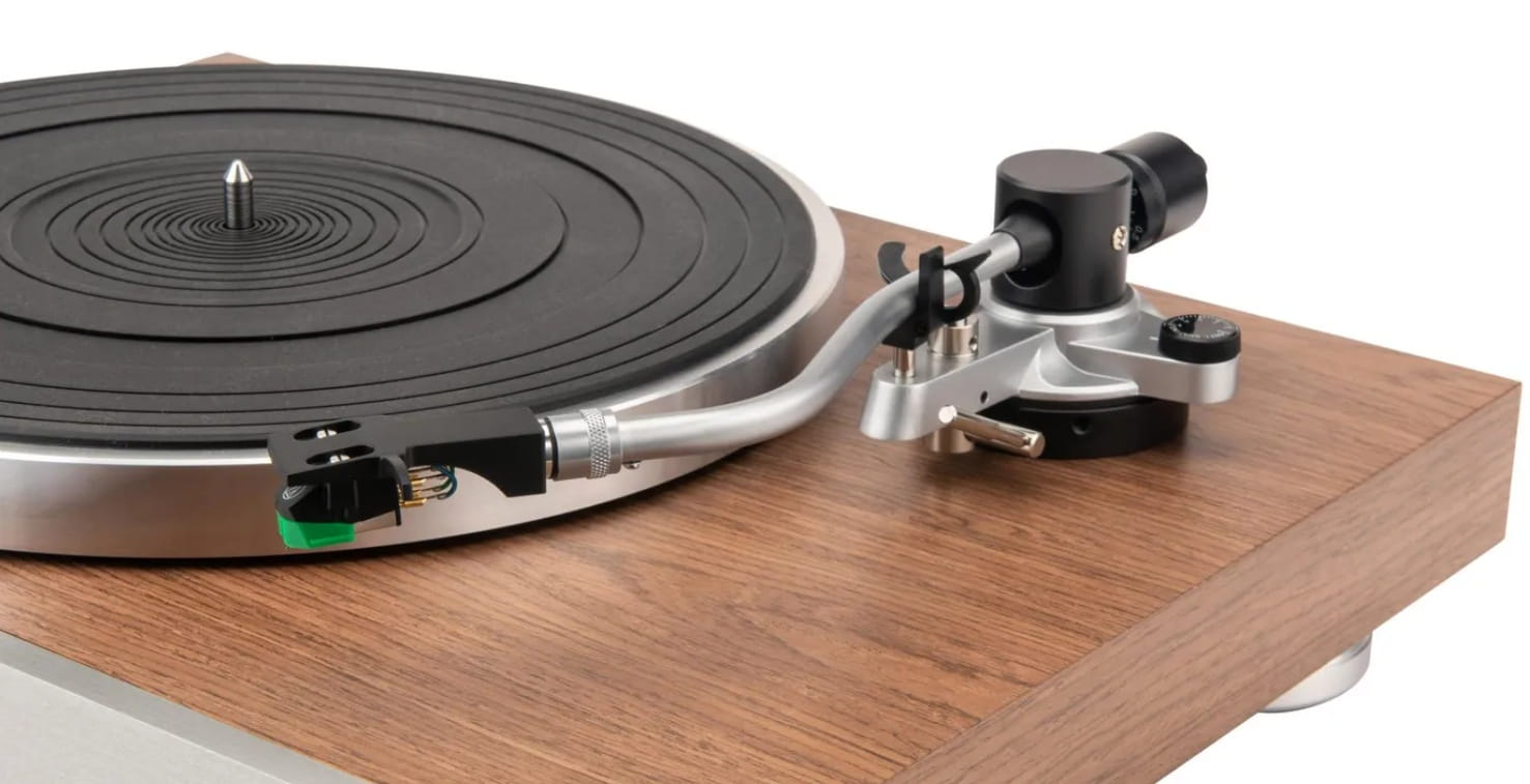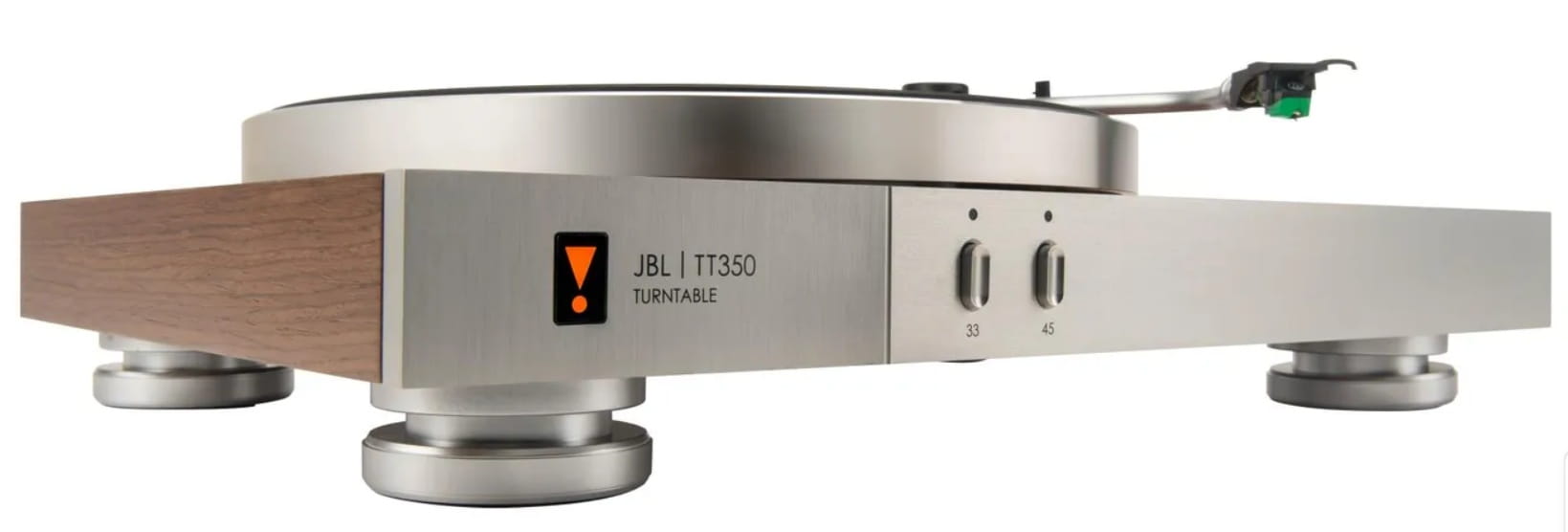 Uzyskaj intymność ze swoją kolekcją płyt dzięki JBL TT350 Classic. Dzięki cokołowi pokrytemu fronirem z drewna orzechowego, ciężkiemu aluminiowemu talerzowi i zakrzywionemu aluminiowemu ramieniu, TT350 Classic jest świadectwem radości z muzyki i płyt winylowych. Silnik Direct Drive zapewnia odtwarzanie płyt w idealnym czasie z potężną dynamiką przy 33,3 obr / min dla płyt LP i 45 obr / min dla EP i singli. Prędkości obrotowe są blokowane za pomocą czujnika prędkości w celu uzyskania idealnej wysokości dźwięku. Ramię jest wyposażone w wysokiej jakości wkładkę z ruchomym magnesem wstępnie zainstalowaną na zdejmowanej głowicy w celu łatwej wymiany i modernizacji. Pionowy kąt śledzenia (VTA) jest regulowany, aby umożliwić stosowanie większych lub mniejszych wkładek podczas modernizacji. Nóżki są tłumione, aby zmniejszyć wibracje przedostające się do płyty i regulowane, aby umożliwić ustawienie TT350 Classic na nierównych powierzchniach.