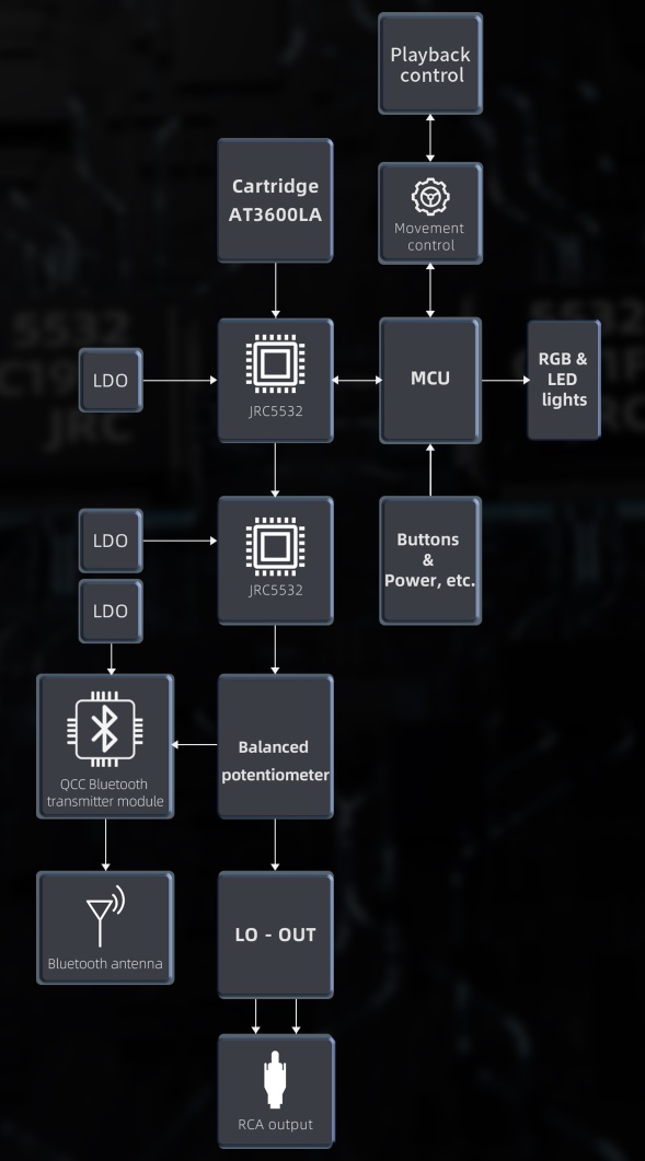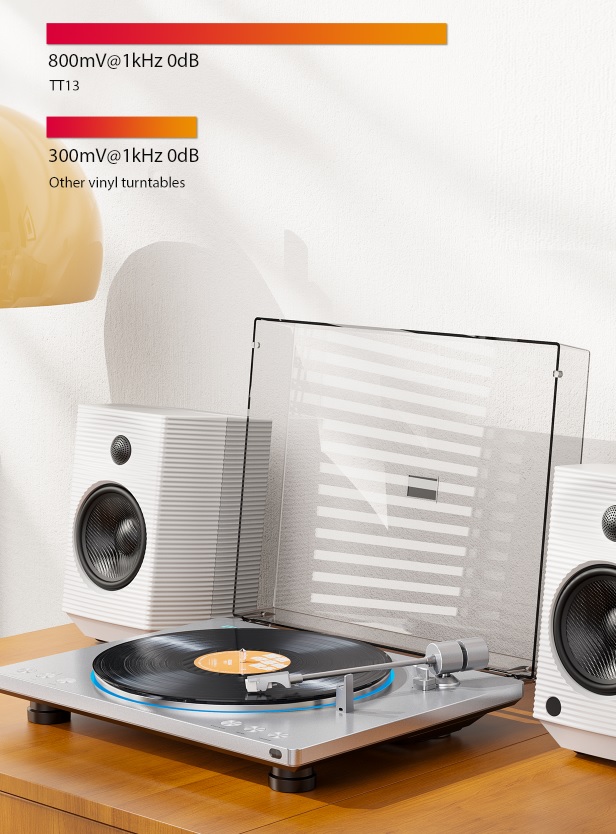 TT13 posiada również wysokowydajny, starannie dostrojony przedwzmacniacz gramofonowy. Poziom wyjścia liniowego może osiągnąć 800 mV@1 kHz 0 dB, co stanowi zdecydowanie lepszy wynik, niż w przypadku porównywalnych produktów, a także doskonalszy stosunek sygnału do szumu i zmniejszone przesłuchy - wszystko dla potężnego dźwięku. Wbudowany przedwzmacniacz gramofonowy eliminuje potrzebę zakupu osobnego urządzenia, znacznie obniżając koszty konfiguracji systemu audio z gramofonem. Dodatkowo, można go łatwo sparować z głośnikami aktywnymi.