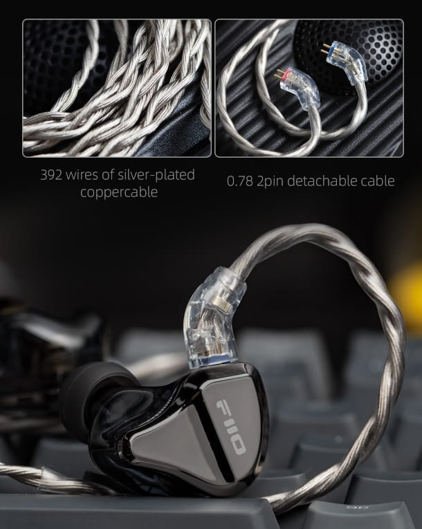 FIIO JH5 jest standardowo wyposażony w kabel wykonany z posrebrzanych miedzianych przewodników o wysokiej czystości. Każde 14 z nich jest skręconych w małą żyłkę, a 7 tych małych żył tworzy jedno duże pasmo. Kabel JH5, składający się łącznie z 4 dużych żył, zawiera łącznie 392 przewody. Każdy z nich jest niezależnie izolowany i pleciony w splocie Litz, co zwiększa powierzchnię przewodzącą i poprawia szczegółowość wysokich częstotliwości.