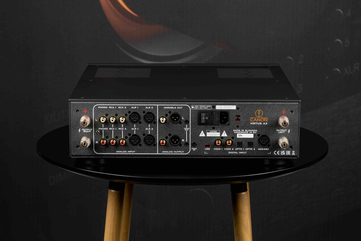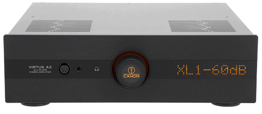 Canor Virtus A3 to hybrydowy wzmacniacz All-In-One Dual Mono klasy A/AB z pełnym zestawem wejść cyfrowych i analogowych, zawierający wzmacniacz mocy, przedwzmacniacz gramofonowy, wzmacniacz słuchawkowy i przetwornik cyfrowo-analogowy w jednym urządzeniu.