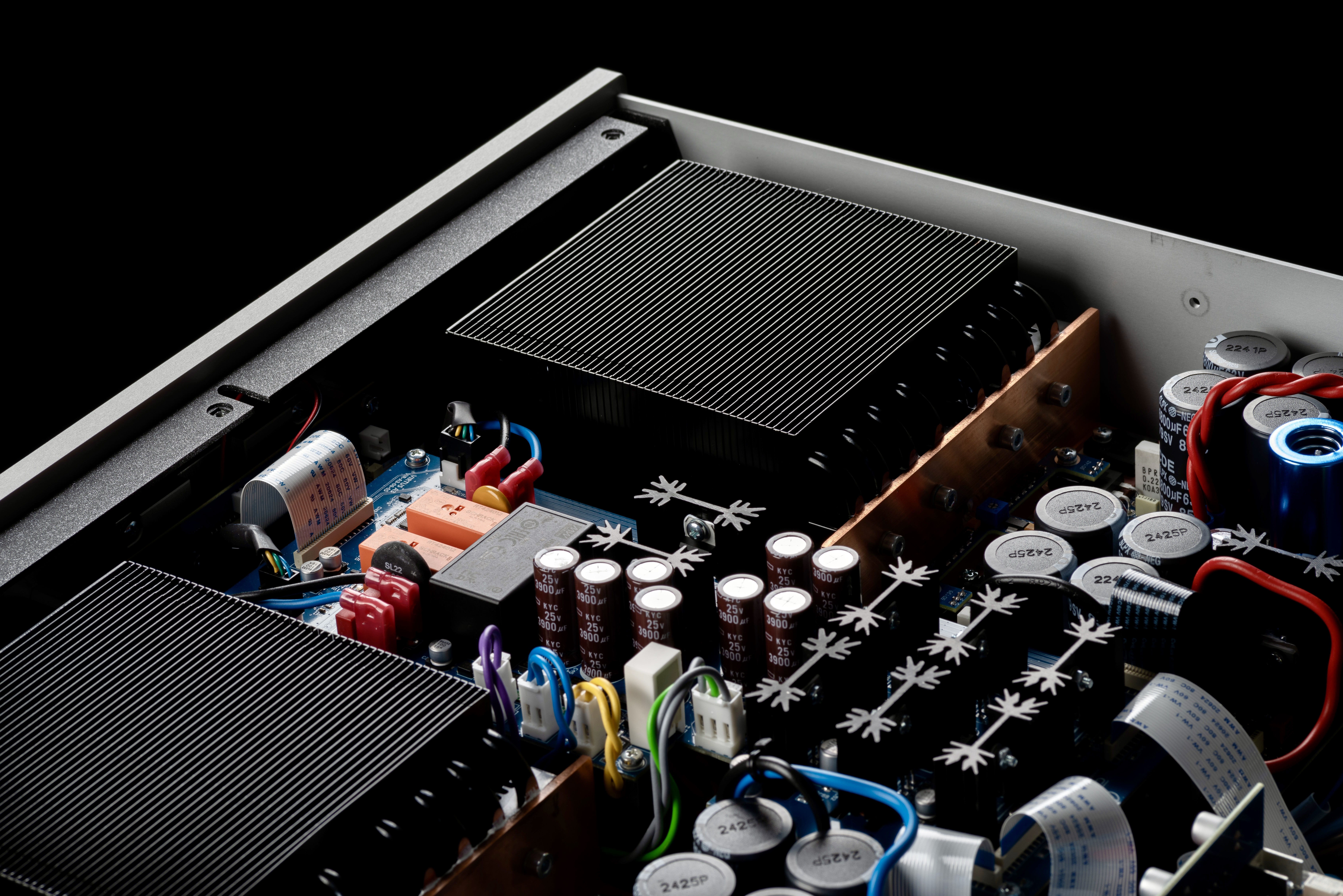 Ten wyrafinowany system chłodzenia łączy w sobie rurki cieplne, radiatory i wentylatory o niskiej prędkości obrotowej, co jest rzadkim rozwiązaniem we wzmacniaczach audio. Konstrukcja ta skutecznie odprowadza ciepło z dala od stopni mocy, zapewniając stabilną wydajność nawet przy dużych obciążeniach, utrzymując optymalną temperaturę bez hałasu. To unikalne podejście zwiększa zarówno niezawodność, jak i trwałość urządzenia.