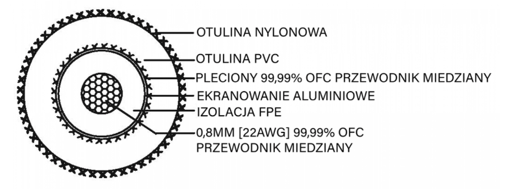 | Ekranowanie | Podwójne ekranowanie: skręcana miedź beztlenowa 99,99% (64 żyłek x 0.12 mm) oraz aluminiowe Ultra-wydajna izolacja FPE z otulinami: nylonową i PVC |