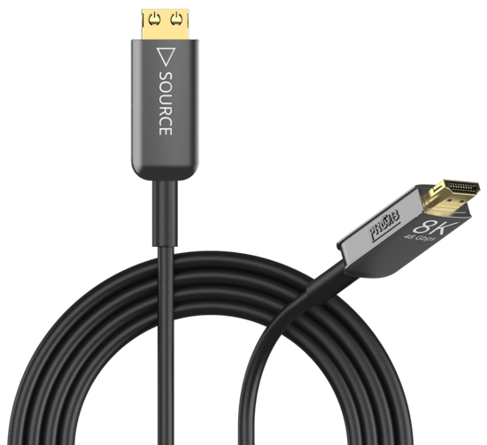 • jest w stanie przesyłać rozdzielczości do 8K (7680 x 4320p) 4:4:4 przy 60 Hz z przepustowością 48 Gbps za pośrednictwem technologii światłowodowej OM3, eliminując możliwość zakłóceń elektronicznych