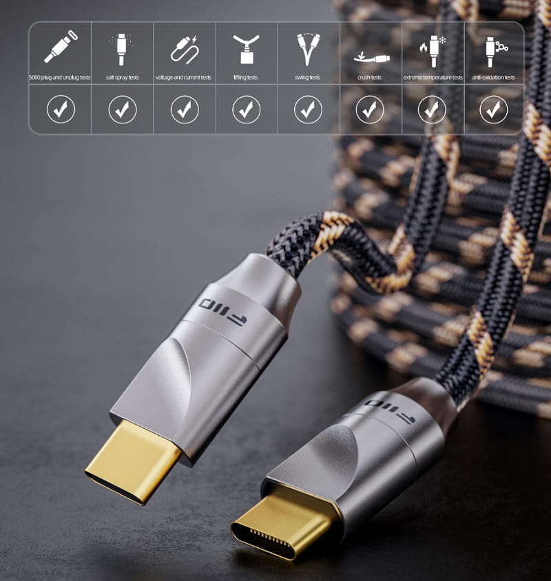 Kabel przeszedł rygorystyczne testy wytrzymałościowe FiiO, które obejmują 5000 testów podłączeń i odłączeń, testy w komorze solnej, testy napięcia i prądu, testy podnoszenia, testy wahadłowe, testy zgniatania, testy w ekstremalnych temperaturach, testy antyutleniające itp. w celu zapewnienia, że LT-TC5 jest naprawdę niezawodnym kablem.