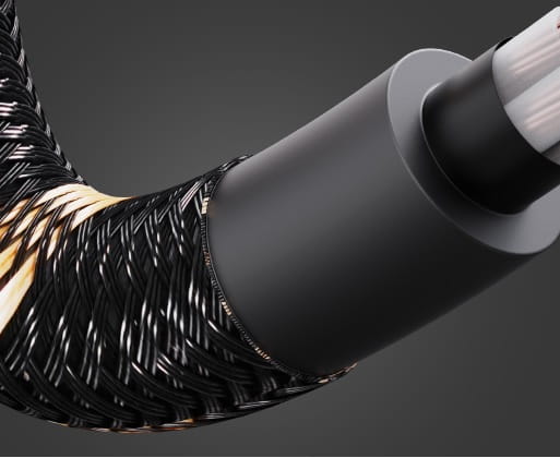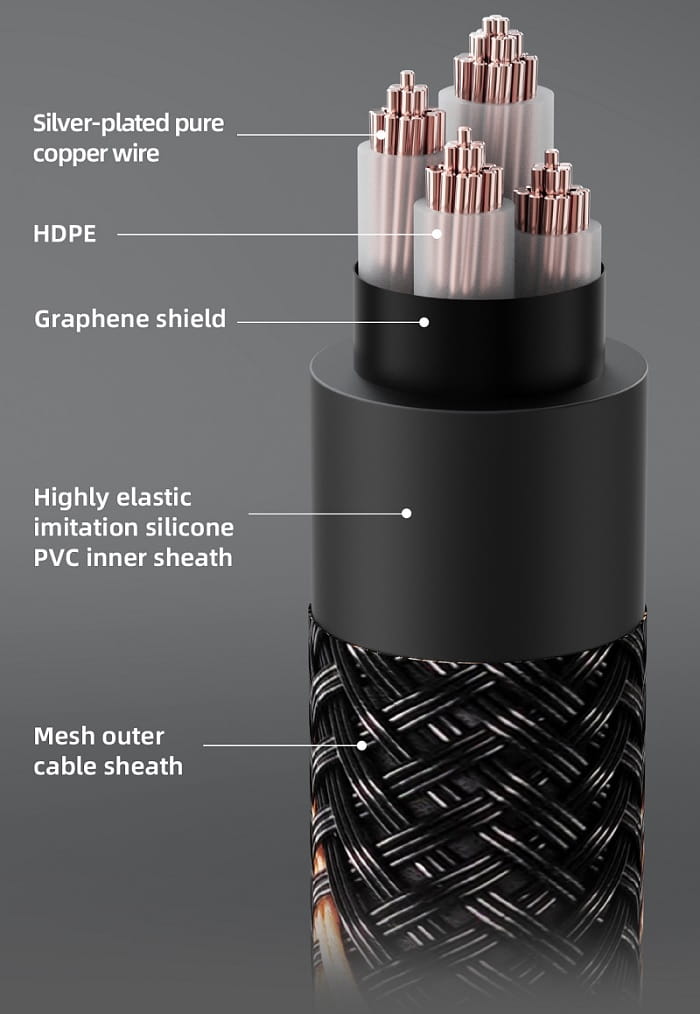 Wewnątrz tego kabla znajduje się główne pasmo z 44 żyłami oraz trzy pasma po 18 żył, każda wykonana z posrebrzanej czystej miedzi, wszystkie chronione warstwą izolacyjną HDPE. Przewodniki te charakteryzują się niższą rezystancją i większą przewodnością w porównaniu do typowych drutów miedzianych stosowanych w kablach, co zapewnia stabilniejszą transmisję sygnałów cyfrowych.