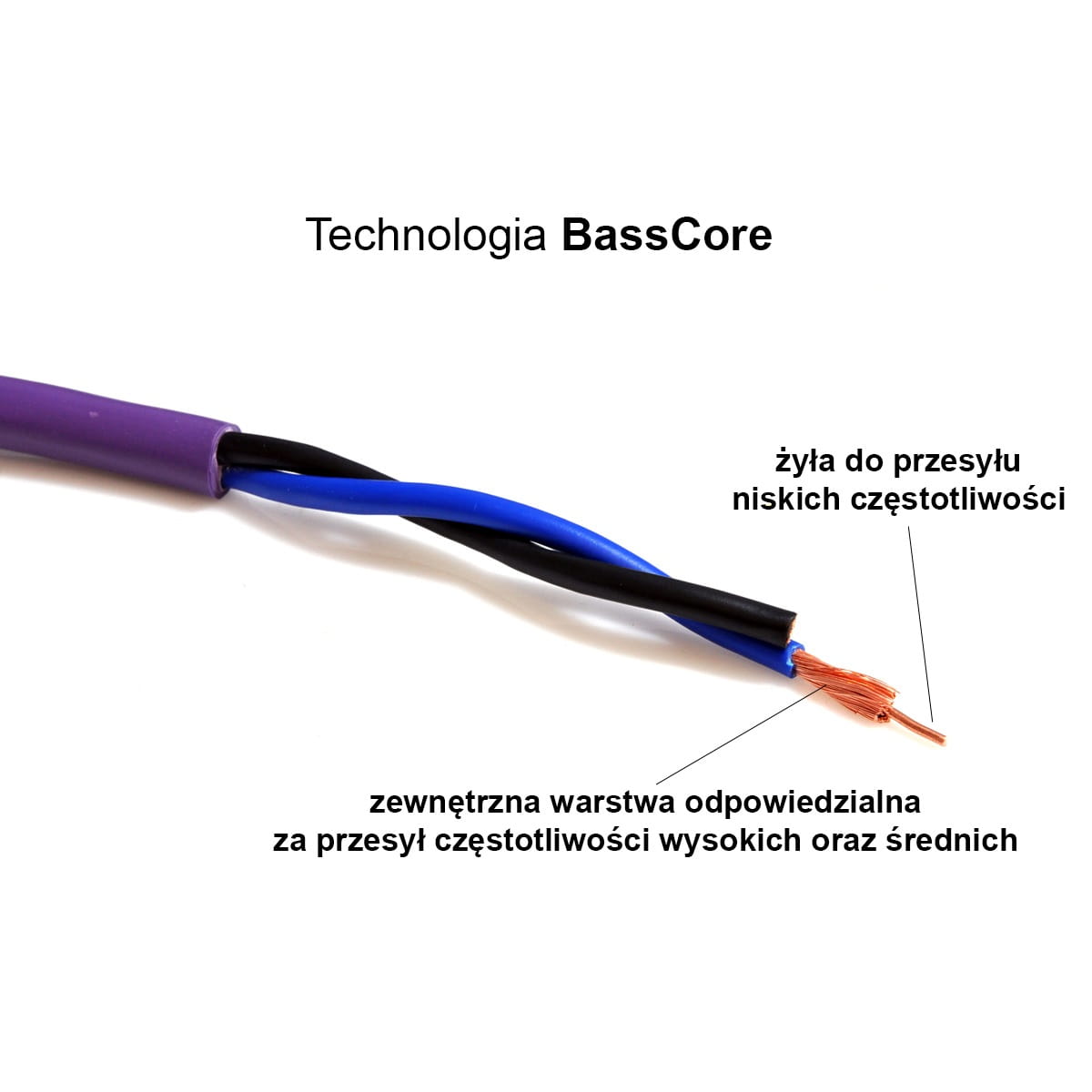 Specjalistyczne badania udowodniły, że niskie częstotliwości biegną szybciej wewnątrz przewodnika, natomiast częstotliwości średnio-wysokie na powierzchni przewodnika. Technologia BassCore w tym przewodzie wykorzystuje 0.85mm przewód do przenoszenia częstotliwości niskich oraz wiązki 110 x 0.15mm odpowiedzialna za częstotliwości wysokie oraz średnie.