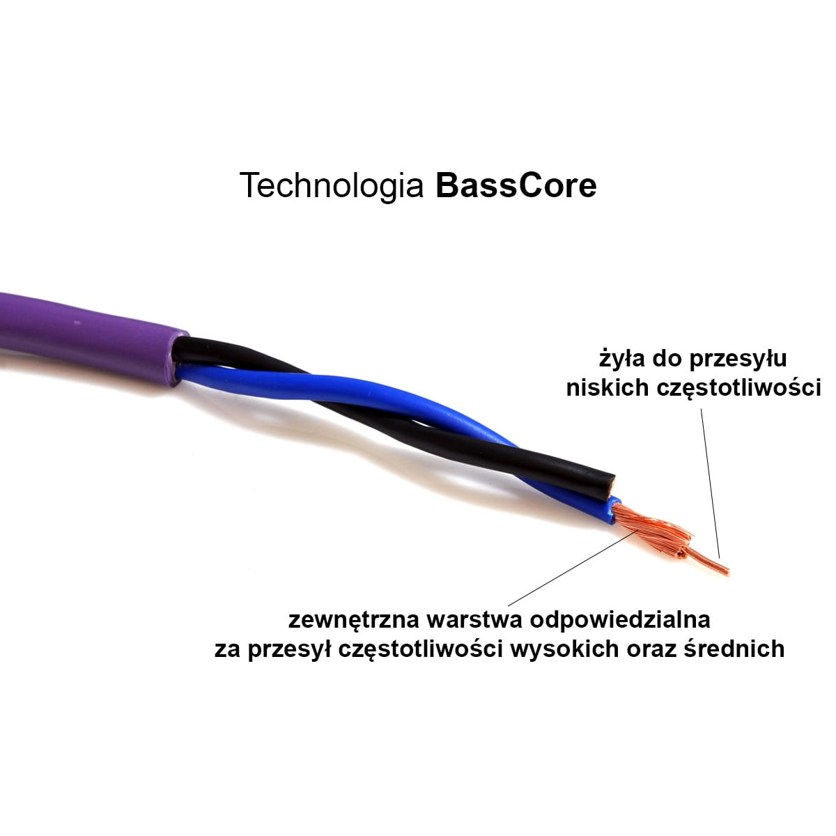 Specjalistyczne badania udowodniły, że niskie częstotliwości biegną szybciej wewnątrz przewodnika, natomiast częstotliwości średnio-wysokie na powierzchni przewodnika. Technologia BassCore w tym przewodzie wykorzystuje 1.10mm przewód do przenoszenia częstotliwości niskich oraz wiązki 170 x 0.15mm odpowiedzialna za częstotliwości wysokie oraz średnie.