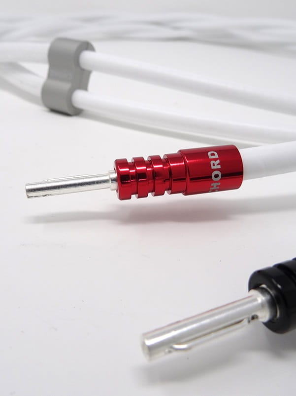Wielożyłowy kabel 2 x 10AWG z posrebrzanej, mikropolerowanej miedzi beztlenowej, indywidualnie ekranowane skręcone przewodniki, izolacja PTFE. Ekranowanie: podwójny warkocz foliowy, szczególnie efektywny przy bardzo wysokich częstotliwościach. Płaszcz PTFE zapewniający tłumienie mechanicznych szumów. Kolor biały. Końcówki: 24-karatowe pozłacane wtyki bananowe Chord, pozłacane widły lub BFA Camcon.