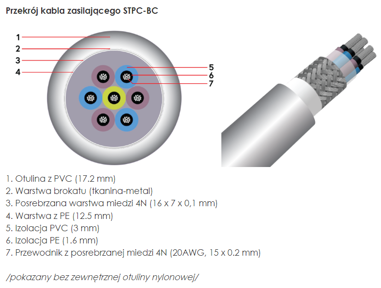 Otulina z nylonu Otulina z PVC (17.2 mm) Warstwa brokatu (tkanina-metal) Pleciona posrebrzana warstwa miedzi 4N (16 x 7 x 0,1 mm) Warstwa PE (12.5 mm)