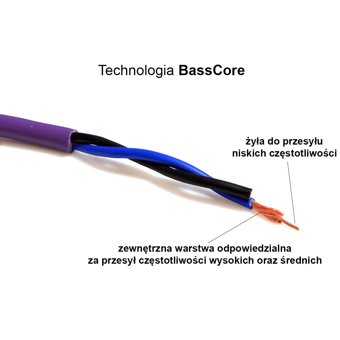 Gotowy przewód głośnikowy o przekroju 2x 2.5mm2 wykonany w technologii BassCore, która pozwala na przesył sygnałów niskich oraz wysoko-średnich osobnymi żyłami. Kabel został zakończony specjalnymi wtykami bananowymi, które dodatkowo zostały zaciśnięte koszulkami silikonowymi. Specjalistyczne badania udowodniły, że niskie częstotliwości biegną szybciej wewnątrz przewodnika, natomiast częstotliwości średnio-wysokie na powierzchni przewodnika. Technologia BassCore w tym przewodzie wykorzystuje 1 x 0.85 mm przewód do przenoszenia częstotliwości niskich oraz wiązki 70 x 0.15mm odpowiedzialne za częstotliwości wysokie oraz średnie.