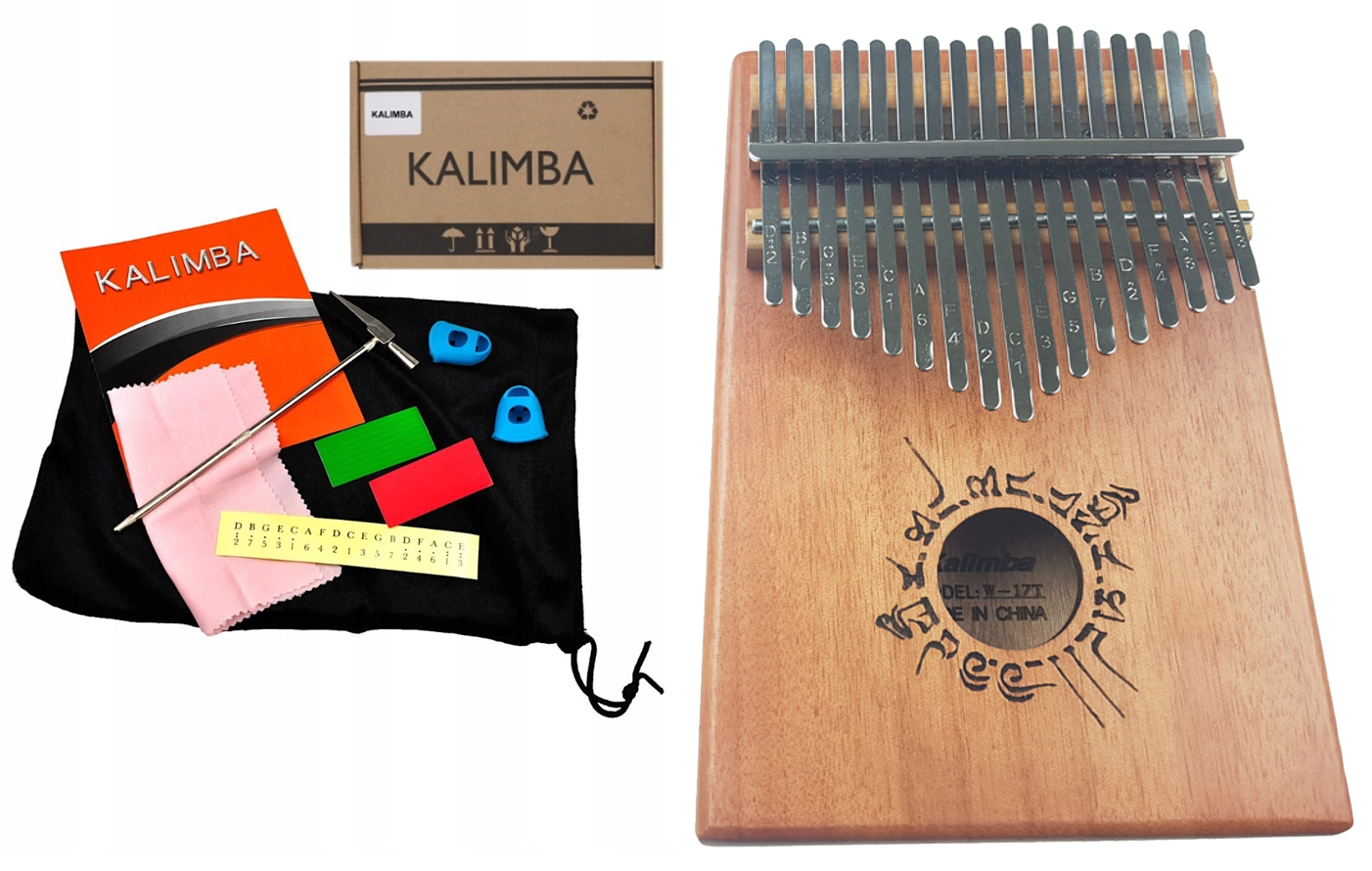 Pianino kciukowe, młotek strojeniowy, aksamitną torbę, ściereczkę do czyszczenia, osłonę palców, naklejkę w kolorze czerwonym i zielonym oraz instrukcje do nauki