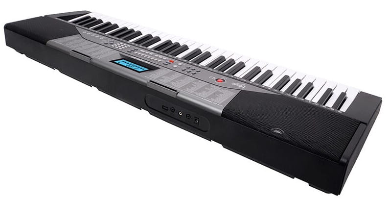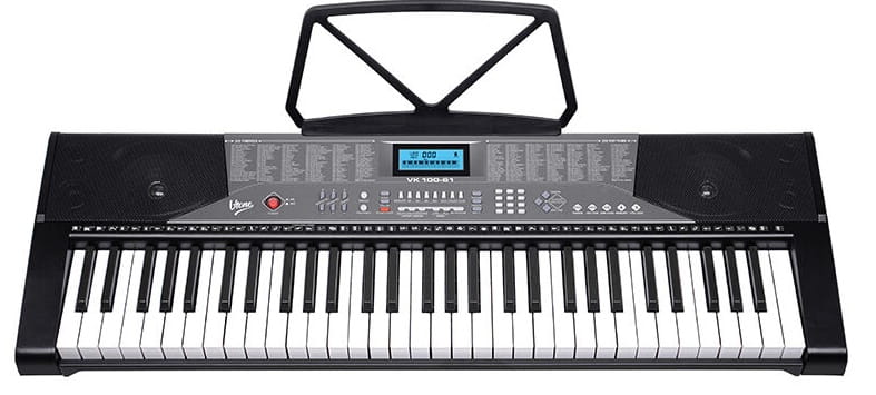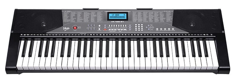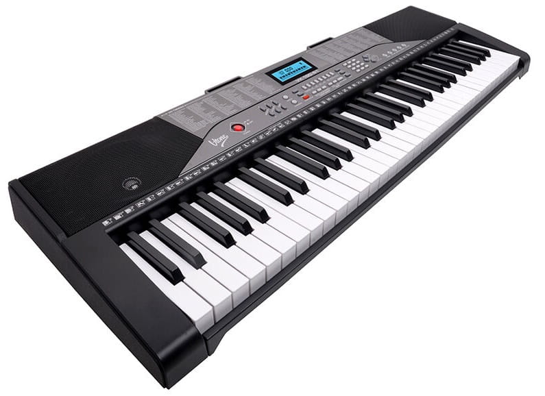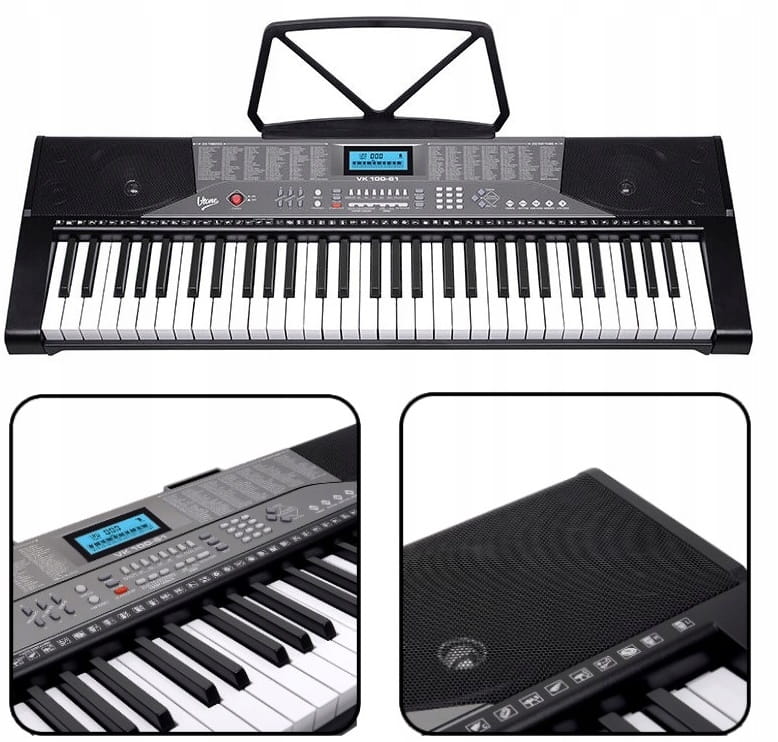 V-TONE VK 100-61 to edukacyjny ✅ keyboard do nauki gry na pianinie, wyposażony w cyfrowy ekran, 61 pełnowymiarowych, fortepianowych klawiszy, 255 instrumentów, 255 podkładów rytmicznych, perkusję oraz 50 utworów demonstracyjnych. Do tego obszerny tryb lekcji, funkcje kontroli ekspresji Sustain i Vibrato, tryb nagrywania i odtwarzania, a także wejście mikrofonowe, wejście audio i wyjście na słuchawki.