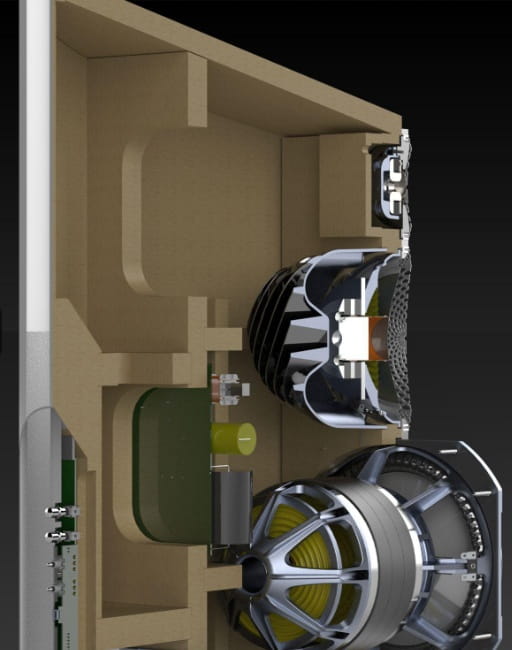 Przetworniki tworzą pasywny układ górno-rejestrowy pasma dostarczając dokładniejszą i szerszą dynamikę (ze szczegółowymi dobrze skomponowanymi niskimi 40kHz aż do głębokich 500Hz), jednocześnie pozostając praktycznie transparentnym; dźwięk pozostaje w centrum uwagi. Mocna sekcja basowa wykorzystuje dyferencyjny 8.5” przetwornik z technologią Ultra-High-Excursion zbalansowany tak, by maksymalnie zniwelować szumy i drgania (dwa skierowane frontowo oraz dwa skierowane w tył).