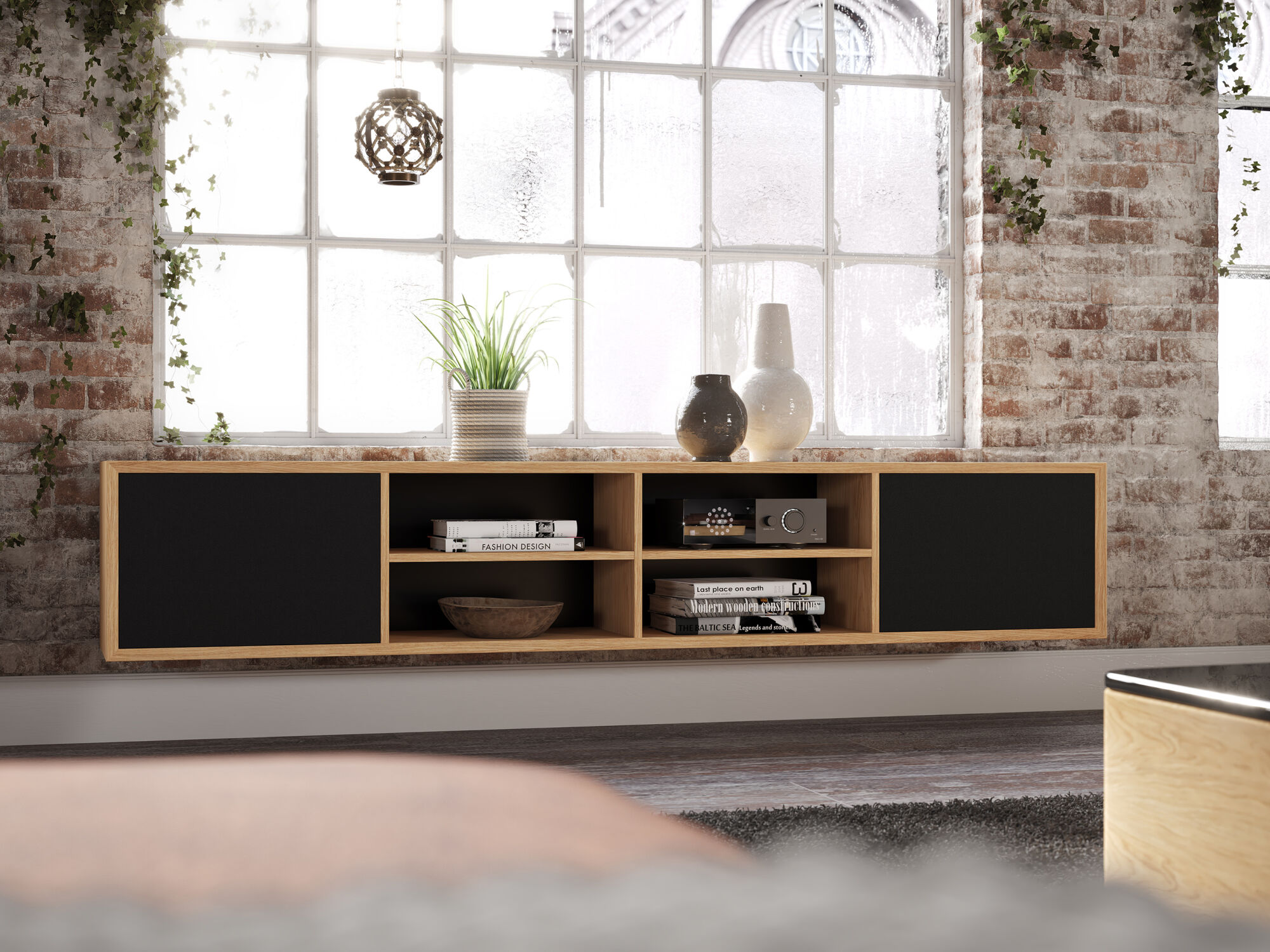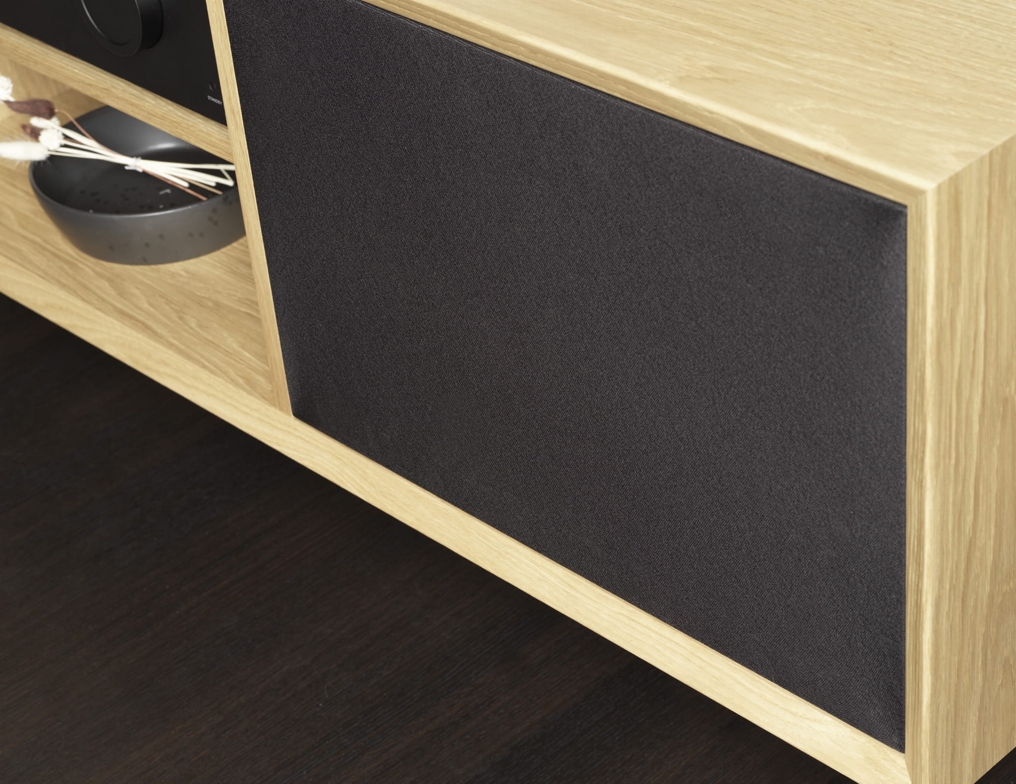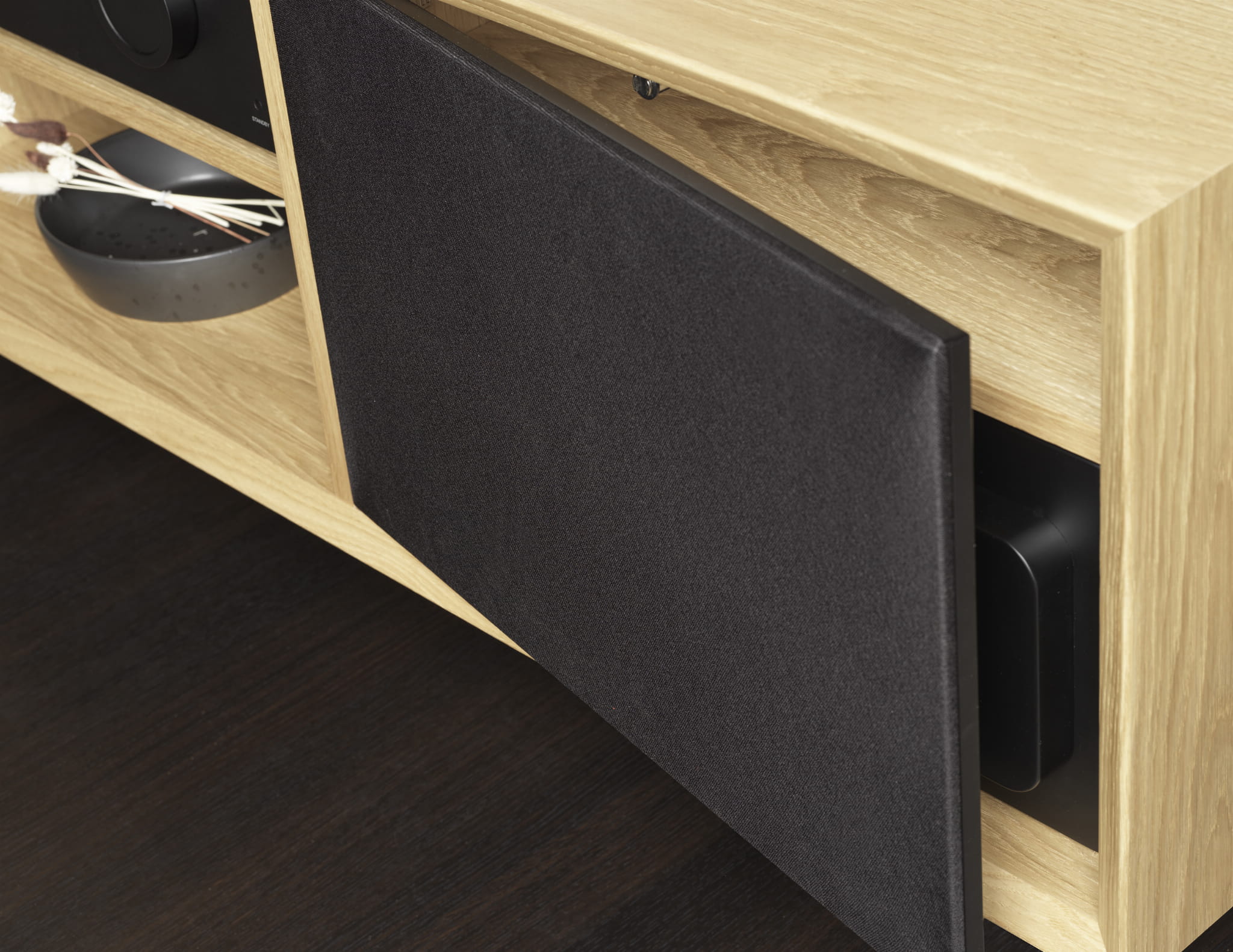- takie specjalne umieszczenie głośnika pozwala zmniejszyć dyfrakcję dźwięku na krawędziach wnęki meblowej i poprawia kierowanie dźwięku w stronę obszaru odsłuchu, a co za tym idzie zapewnia lepsze budowanie przestrzeni dźwiękowej