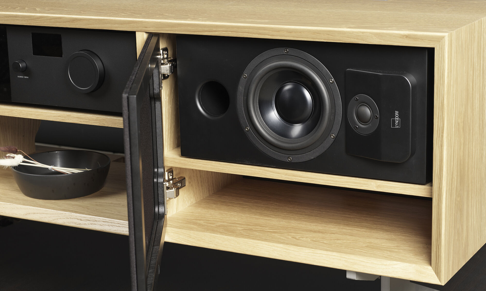 Zaprojektowany do umieszczenia w szafkach i meblach głośnik Lyngdorf CS-1 charakteryzuje się solidną konstrukcją z MDF, z trwałym i łatwym do czyszczenia matowym czarnym lakierem. Wraz z głośnikiem dostarczane są samoprzylepne gumowe podkładki, które zapobiegają zarysowaniu powierzchni mebli, a jednocześnie zapobiegają przenoszeniu rezonansu z głośnika na szafkę. Głośnik Lyngdorf CS-1 jest dostarczany bez przedniej maskownicy, co pozwala mu dostarczać najczystszy dźwięk, na przykład za drzwiami z tkaniny w meblach telewizyjnych.