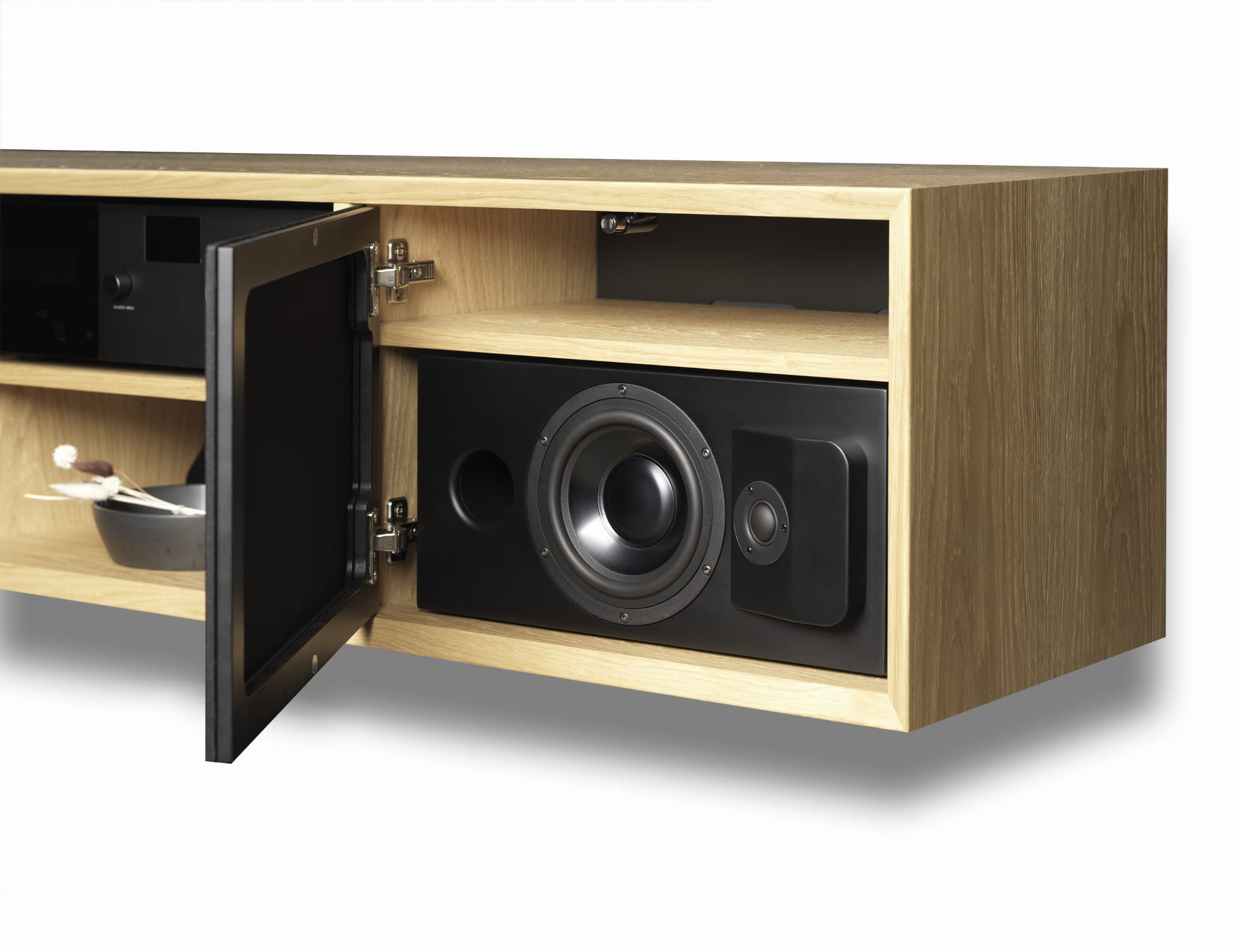 - kompaktowy głośnik pełnozakresowy, zaprojektowany specjalnie, aby umożliwiać dyskretne umieszczenie w szafkach, takich jak szafki stojące, komody i szafki pod telewizor