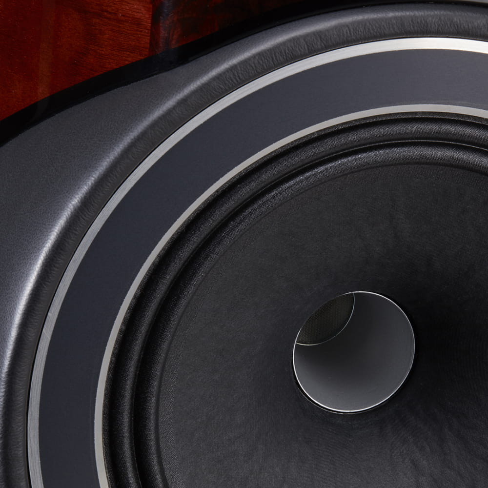 System dyfuzorów Tractrix BassTrax™ naszej konstrukcji (sprawa patentowa w toku) z portem emitującym dźwięk w dół zamienia płaskie czoło fali opuszczającej tunel w falę rozszerzającą się do postaci sferycznej i opuszczającej konstrukcję już w kącie 360˚, dystrybuując energię równomiernie w pomieszczeniu odsłuchowym. Wykonana z solidnych bloków aluminium, integrująca energię portu z pomieszczeniem, potężna platforma o masie 16 kg zapewnia wyjątkową stabilność, gwarantującą precyzję odtwarzania niskich częstotliwości i dokładną reprodukcję drobnych detali. Dwukomorowy system strojący redukuje wewnętrzne fale stojące i zmniejsza wychylenie membrany w okolicach częstotliwości strojenia, zapewniając lepsze sterowanie mocą.