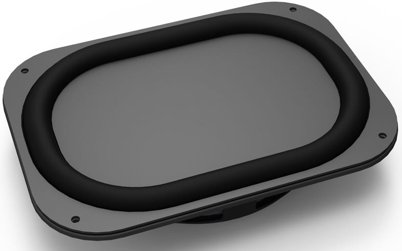 - aktywne głośniki niskotonowe zostały sprzężone z dwoma parami przeciwlegle umieszczonych, inercjalnie wyważonych, płaskich radiatorów infradźwiękowych o rozmiarach 7” x 10”, które zlokalizowano po bokach obudowy, tuż nad poziomem podłogi, aby zapewnić optymalną interakcję niskich tonów z pomieszczeniem