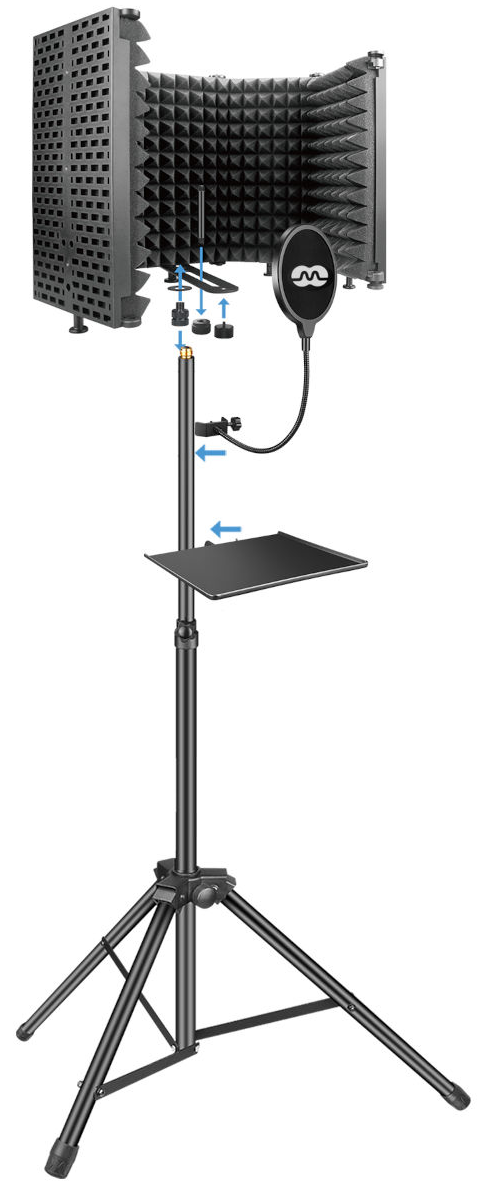 | W zestawie | 1 * osłona dźwiękowa (z akcesoriami montażowymi)., 1 * statyw (tripod)., 1 * taca na interfejs itp., 1 * filtr pop. |