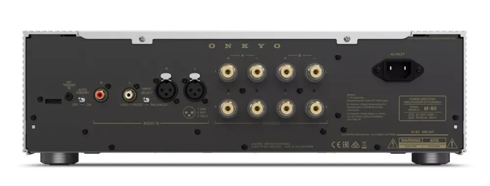 Wzmacniacz mocy Onkyo M-80 to solidna i precyzyjnie wykonana konstrukcja. Wyposażony jest w niestandardowy zasilacz o wysokim prądzie, który gwarantuje dynamiczny, pełnozakresowy dźwięk. W celu tłumienia wibracji zastosowano ekstrudowany, aluminiowy radiator.