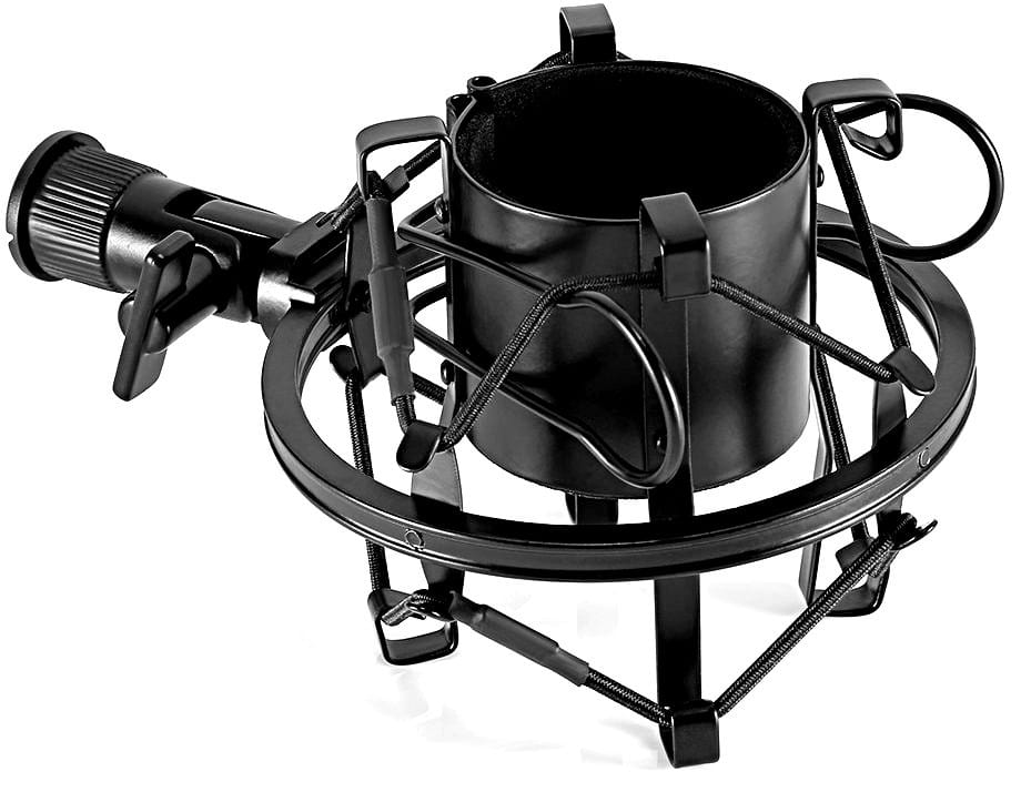 Uchwyt zaciskowy w koszu antywibracyjnym pasuje do wielu dużych studyjnych mikrofonów pojemnościowych.
